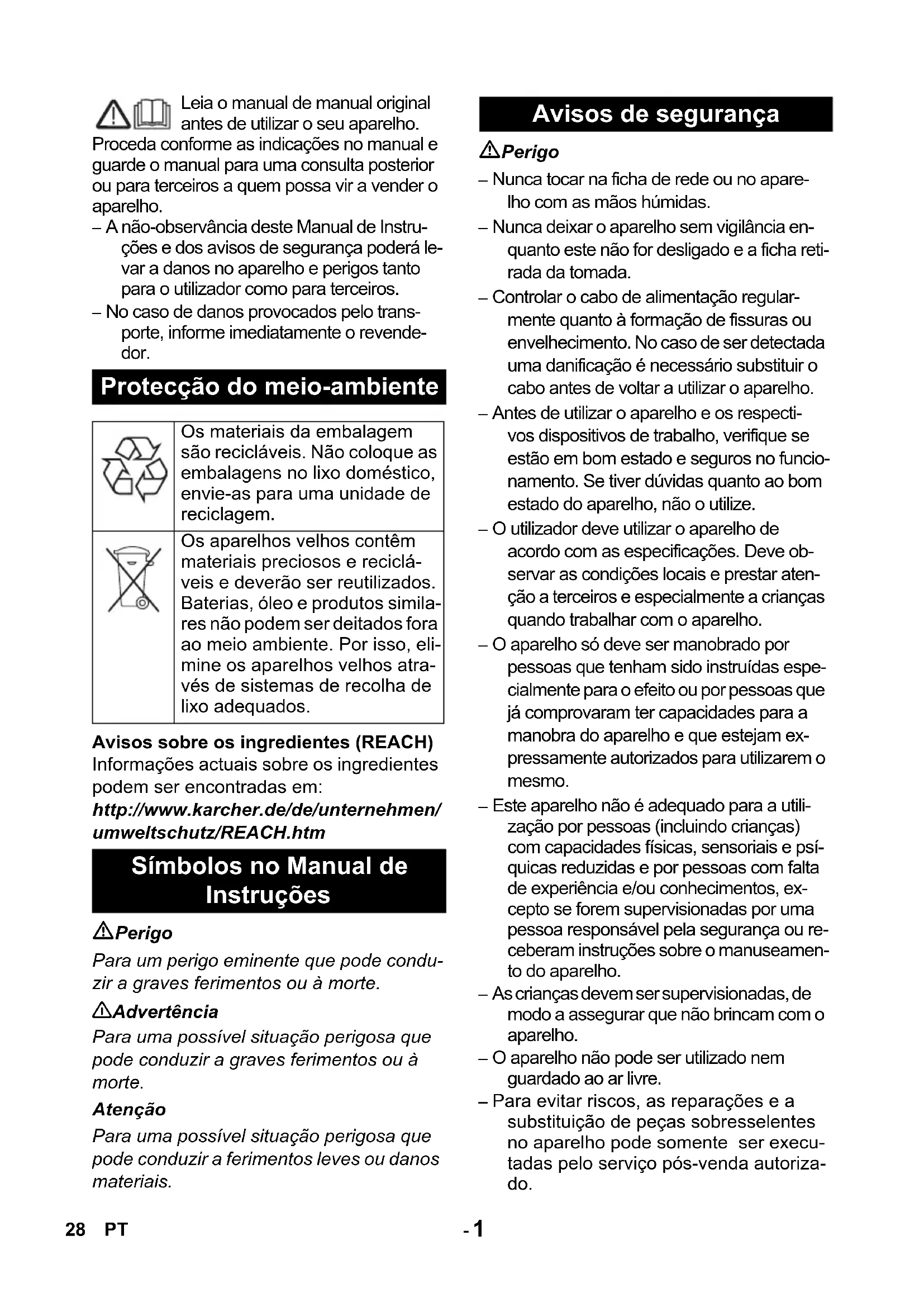 CEO Head of Approbation 27ES- 1 Leia o manual de manual original antes de utilizar o seu aparelho. Proceda conforme as indicações no manual e guarde o manual para uma consulta posterior ou para terceiros a quem possa vir a vender o aparelho. – A não-observância deste Manual de Instru- ções e dos avisos de segurança poderá le- var a danos no aparelho e perigos tanto para o utilizador como para terceiros. – No caso de danos provocados pelo trans- porte, informe imediatamente o revende- dor. Avisos sobre os ingredientes (REACH) Informações actuais sobre os ingredientes podem ser encontradas em: http://www.karcher.de/de/unternehmen/ umweltschutz/REACH.htm Perigo Para um perigo eminente que pode condu- zir a graves ferimentos ou à morte. 몇 Advertência Para uma possível situação perigosa que pode conduzir a graves ferimentos ou à morte. Atenção Para uma possível situação perigosa que pode conduzir a ferimentos leves ou danos materiais. Perigo – Nunca tocar na ficha de rede ou no apare- lho com as mãos húmidas. – Nunca deixar o aparelho sem vigilância en- quanto este não for desligado e a ficha reti- rada da tomada. – Controlar o cabo de alimentação regular- mente quanto à formação de fissuras ou envelhecimento. No caso de ser detectada uma danificação é necessário substituir o cabo antes de voltar a utilizar o aparelho. – Antes de utilizar o aparelho e os respecti- vos dispositivos de trabalho, verifique se estão em bom estado e seguros no funcio- namento. Se tiver dúvidas quanto ao bom estado do aparelho, não o utilize. – O utilizador deve utilizar o aparelho de acordo com as especificações. Deve ob- servar as condições locais e prestar aten- ção a terceiros e especialmente a crianças quando trabalhar com o aparelho. – O aparelho só deve ser manobrado por pessoas que tenham sido instruídas espe- cialmente para o efeito ou por pessoas que já comprovaram ter capacidades para a manobra do aparelho e que estejam ex- pressamente autorizados para utilizarem o mesmo. – Este aparelho não é adequado para a utili- zação por pessoas (incluindo crianças) com capacidades físicas, sensoriais e psí- quicas reduzidas e por pessoas com falta de experiência e/ou conhecimentos, ex- cepto se forem supervisionadas por uma pessoa responsável pela segurança ou re- ceberam instruções sobre o manuseamen- to do aparelho. – As crianças devem ser supervisionadas, de modo a assegurar que não brincam com o aparelho. – O aparelho não pode ser utilizado nem guardado ao ar livre. – Para evitar riscos, as reparações e a substituição de peças sobresselentes no aparelho pode somente ser execu- tadas pelo serviço pós-venda autoriza- do. Protecção do meio-ambiente Os materiais da embalagem são recicláveis. Não coloque as embalagens no lixo doméstico, envie-as para uma unidade de reciclagem. Os aparelhos velhos contêm materiais preciosos e reciclá- veis e deverão ser reutilizados. Baterias, óleo e produtos simila- res não podem ser deitados fora ao meio ambiente. Por isso, eli- mine os aparelhos velhos atra- vés de sistemas de recolha de lixo adequados. Símbolos no Manual de Instruções Avisos de segurança 28 PT- 2– Este ventilador foi concebido para a se-cagem de tapetes e alcatifas limpas a húmido.– Este aparelho destina-se única e exclu-sivamente à utilização industrial/profis-sional.Qualquer outra utilização, para além das aqui indicadas, é considerada como não conforme com as disposições legais. O fa-bricante não pode ser responsabilizado por danos daí resultantes. Os riscos devidos a essa utilização indevida são da exclusiva responsabilidade do utilizador.1 Alça de transporte2 Fixação do manípulo de transporte3 Cabo de rede4 Roda de transporte5 Peça de aperto com manípulos em cruz6 Ventoinha7 Punho8 Interruptor da máquinaÎ Montar o manípulo de transporte.Aviso: Ter atenção, durante a colocação do aparelho, que as grelhas de ventilação não sejam obstruídas.Î Abrir portas e janelas o mais que possí-vel, de modo a melhorar a ventilação.Î Colocar o aparelho em cima do tapete que pretende secar.Î Levantar o tapete.Î Deslocar o tapete por baixo da peça de aperto do aparelho e fixar através de revoluções no manípulo em cruz.Î Ligar a ficha de rede.Î Ligar o aparelho.Î Desligar o aparelho. Î Desligue a ficha da tomada. Utilização conforme o fim a que se destina a máquina Elementos do aparelho