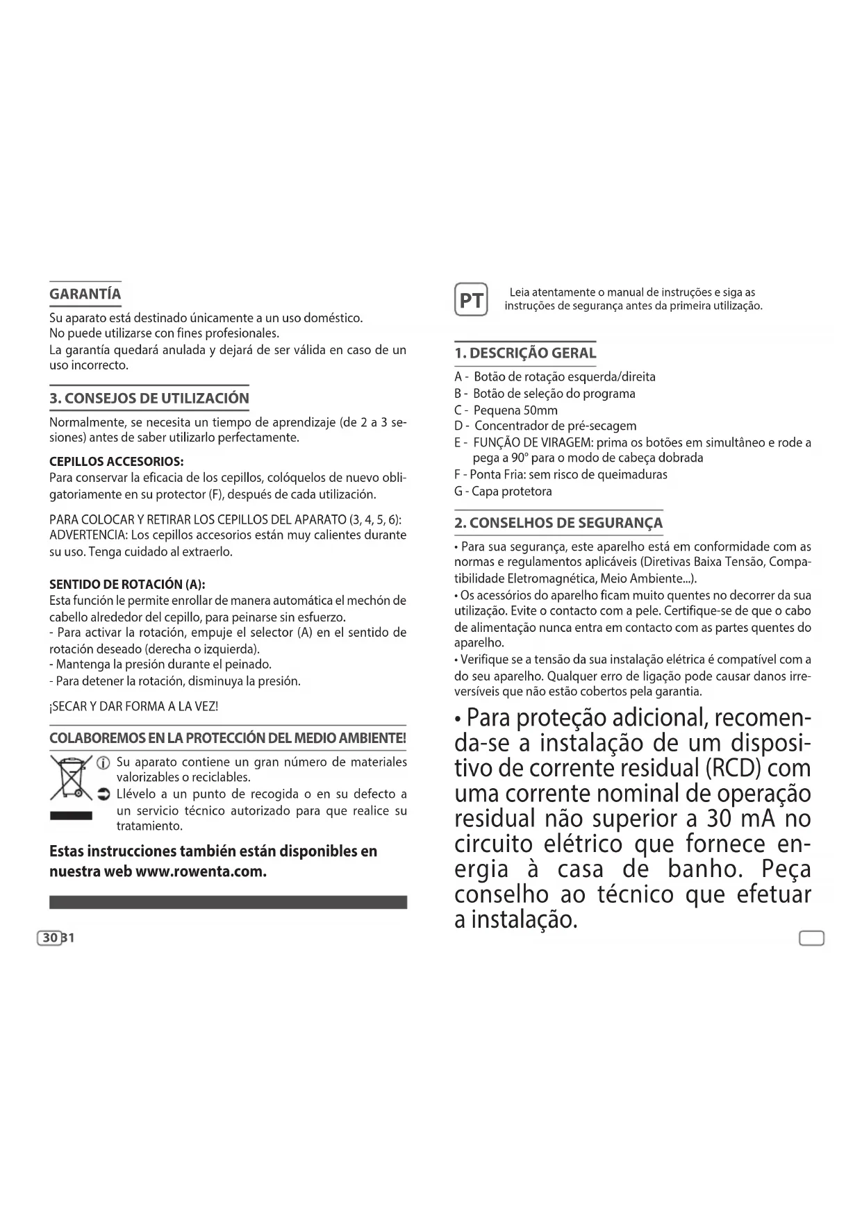 É normalmente necessário um tempo de aprendizagem (2 a 3 sessões) antes de dominar perfeitamente a sua utilização. ESCOVAS Para conservar a eficácia das escovas, guarde-as sempre na respetiva protecção (F) depois de cada utilização. COLOCAR E RETIRAR AS ESCOVAS DO APARELHO (3, 4, 5, 6): LEMBRETE: As escovas ficam muito quentes quando estão a ser uti- lizados. Tenha cuidado quando as retirar. SENTIDO DA ROTAÇÃO (A): Esta função permite-lhe enrolar automaticamente a madeixa de cabelo à volta da escova, para fazer o seu brushing sem qualquer esforço. - Para acionar a rotação, exerça pressão no selector (A) no sentido de rotação pretendido (direita ou esquerda). - Mantenha a pressão durante o brushing - Para interromper a rotação, deixe de fazer pressão. SECAR E PENTEAR CABELO EM SIMULTÂNEO! PROTEÇÃO DO MEIO AMBIENTE EM PRIMEIRO LUGAR! O seu aparelho contém materiais que podem ser recu- perados ou reciclados. Entregue-o num ponto de recolha para possibilitar o seu tratamento. Estas instruções também estão disponíveis no nosso website www.rowenta.pt Διαβάστε προσεκτικά τις οδηγίες χρήσης καθώς και τις οδηγίες ασφαλείας πριν από οποιαδήποτε χρήση.