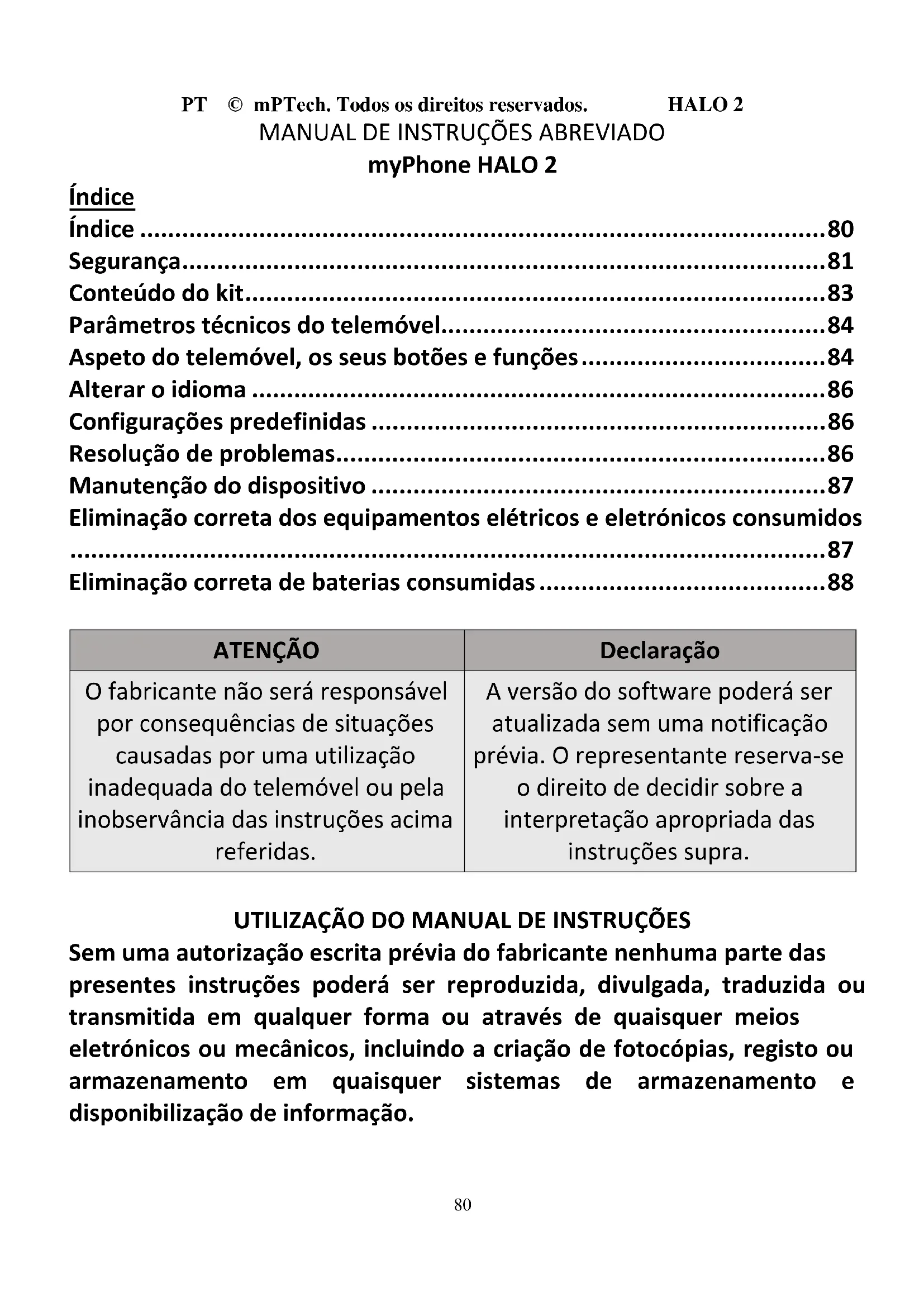 UTILIZAÇÃO DO MANUAL DE INSTRUÇÕES Sem uma autorização escrita prévia do fabricante nenhuma parte das presentes instruções poderá ser reproduzida, divulgada, traduzida ou transmitida em qualquer forma ou através de quaisquer meios eletrónicos ou mecânicos, incluindo a criação de fotocópias, registo ou armazenamento em quaisquer sistemas de armazenamento e disponibilização de informação.PT © mPTech. Todos os direitos reservados. HALO 2