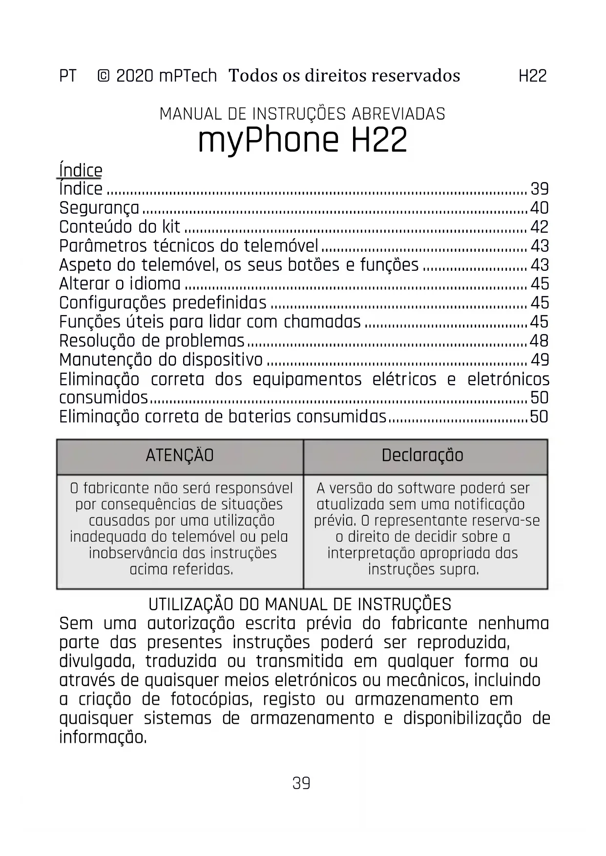 UTILIZAÇÃO DO MANUAL DE INSTRUÇÕES Sem uma autorização escrita prévia do fabricante nenhuma parte das presentes instruções poderá ser reproduzida, divulgada, traduzida ou transmitida em qualquer forma ou através de quaisquer meios eletrónicos ou mecânicos, incluindo a criação de fotocópias, registo ou armazenamento em quaisquer sistemas de armazenamento e disponibilização de informação.PT © 2020 mPTech Todos os direitos reservados H22