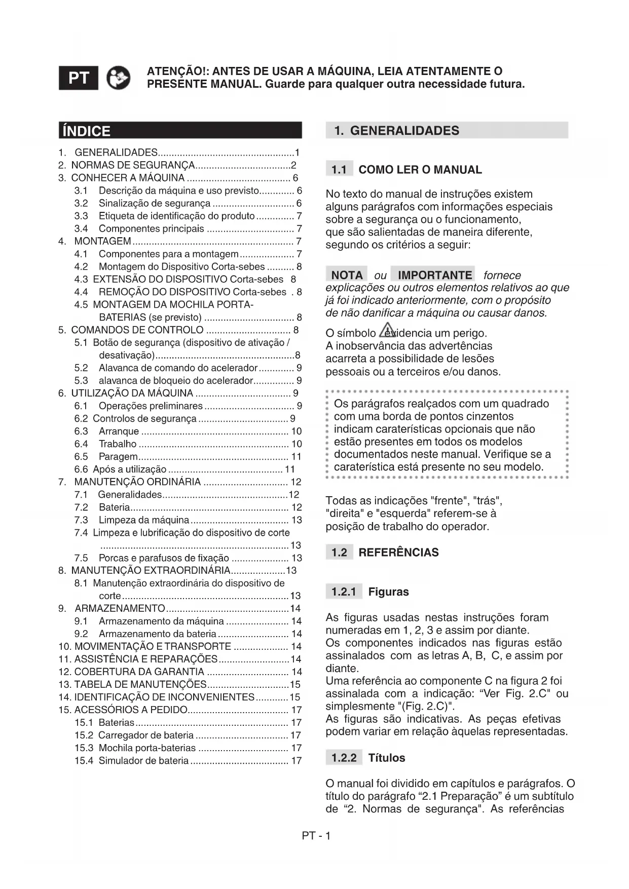 Dispositivo que, se inserido no alojamento da máquina, permite a utilização da mochila porta- baterias.RO - 1 ATENŢIE!: ÎNAINTE DE A UTILIZA MAȘINA, CITIŢI CU ATENŢIE ACEST MANUAL. A se păstra pentru consultări ulterioare.