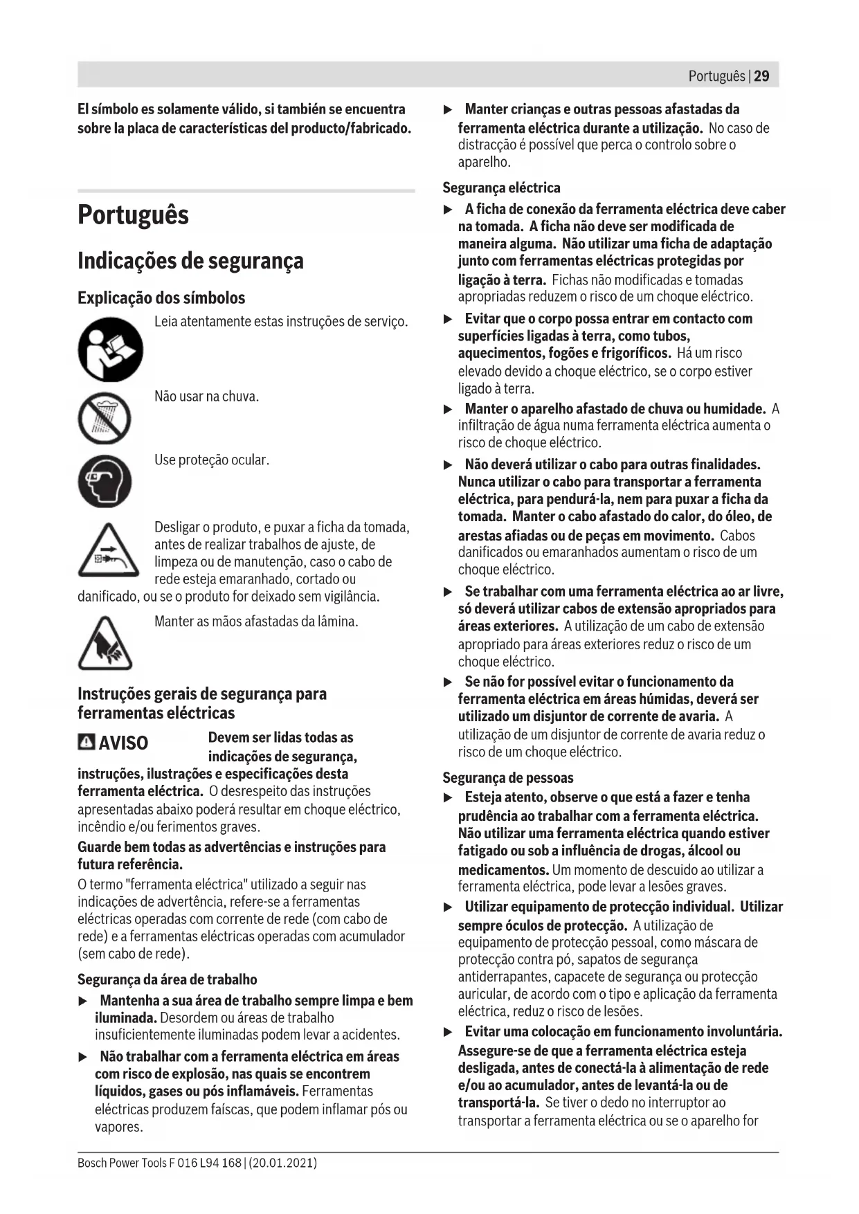1,5 1,5 1,5 O(s) valor(es) total(ais) de vibração e o(s) valor(es) especificado(s) de emissão de ruído devem ter sido medidos de acordo com um método de teste padronizado e podem ser usados para comparar uma ferramenta elétrica com outra. O(s) valor(es) total(ais) de vibração e o(s) valor(es) especificado(s) de emissão de ruído também podem ser usados para uma avaliação preliminar da exposição. As emissões de vibração e ruído durante o uso real da ferramenta elétrica podem divergir dos valores especificados, dependendo da forma como a ferramenta elétrica é usada, em particular o tipo de peça de trabalho que está ser usinada; e – a necessidade de estabelecer medidas de segurança para proteger o operador com base numa estimativa da exposição à vibração durante as condições reais de uso (todas as partes do ciclo operacional devem ser levadas em consideração, por exemplo, os momentos em que a ferramenta elétrica é desligada e aqueles em que é está ligada, mas funciona sem carga). Os valores de emissão de ruído determinados de acordo com EN 62841-4-2:2019. O nível de ruído avaliado como A da ferramenta elétrica é tipicamente: Nível de pressão acústica 75 dB(A); nível de pressão acústica 95 dB(A). Incerteza K =2,0dB. Bosch Power Tools F 016 L94 168 | (20.01.2021)34 | Português Utilizar proteção dos ouvidos! Totais valores de oscilações a