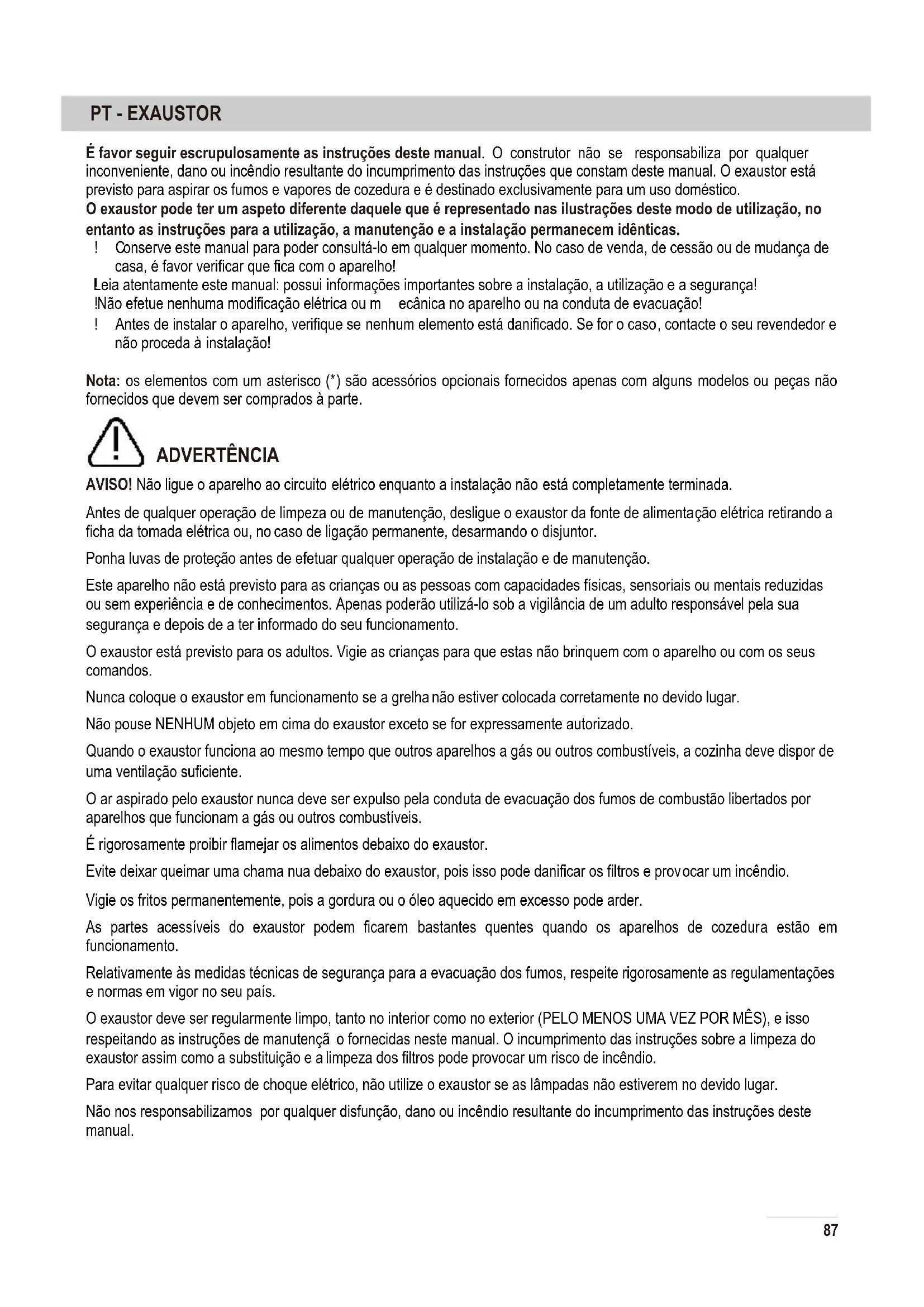 onserve este manual para poder consultá-lo em qualquer momento. No caso de venda, de cessão ou de mudança de casa, é favor verificar que fica com o aparelho! Leia atentamente este manual: possui informações importantes sobre a instalação, a utilização e a segurança! Não efetue nenhuma modificação elétrica ou m ecânica no aparelho ou na conduta de evacuação! Antes de instalar o aparelho, verifique se nenhum elemento está danificado. Se for o caso, contacte o seu revendedor e não proceda à instalação! Nota: os elementos com um asterisco (*) são acessórios opcionais fornecidos apenas com alguns modelos ou peças não fornecidos que devem ser comprados à parte. ADVERTÊNCIA AVISO! Não ligue o aparelho ao circuito elétrico enquanto a instalação não está completamente terminada. Antes de qualquer operação de limpeza ou de manutenção, desligue o exaustor da fonte de alimentação elétrica retirando a ficha da tomada elétrica ou, no caso de ligação permanente, desarmando o disjuntor. Ponha luvas de proteção antes de efetuar qualquer operação de instalação e de manutenção. Este aparelho não está previsto para as crianças ou as pessoas com capacidades físicas, sensoriais ou mentais reduzidas ou sem experiência e de conhecimentos. Apenas poderão utilizá-lo sob a vigilância de um adulto responsável pela sua segurança e depois de a ter informado do seu funcionamento. O exaustor está previsto para os adultos. Vigie as crianças para que estas não brinquem com o aparelho ou com os seus comandos. Nunca coloque o exaustor em funcionamento se a grelha não estiver colocada corretamente no devido lugar. Não pouse NENHUM objeto em cima do exaustor exceto se for expressamente autorizado. Quando o exaustor funciona ao mesmo tempo que outros aparelhos a gás ou outros combustíveis, a cozinha deve dispor de uma ventilação suficiente. O ar aspirado pelo exaustor nunca deve ser expulso pela conduta de evacuação dos fumos de combustão libertados por aparelhos que funcionam a gás ou outros combustíveis. É rigorosamente proibir flamejar os alimentos debaixo do exaustor. Evite deixar queimar uma chama nua debaixo do exaustor, pois isso pode danificar os filtros e prov ocar um incêndio. Vigie os fritos permanentemente, pois a gordura ou o óleo aquecido em excesso pode arder. As partes acessíveis do exaustor podem ficarem bastantes quentes quando os aparelhos de cozedura estão em funcionamento. Relativamente às medidas técnicas de segurança para a evacuação dos fumos, respeite rigorosamente as regulamentações e normas em vigor no seu país. O exaustor deve ser regularmente limpo, tanto no interior como no exterior (PELO MENOS UMA VEZ POR MÊS), e isso respeitando as instruções de manutençã o fornecidas neste manual. O incumprimento das instruções sobre a limpeza do exaustor assim como a substituição e a limpeza dos filtros pode provocar um risco de incêndio. Para evitar qualquer risco de choque elétrico, não utilize o exaustor se as lâmpadas não estiverem no devido lugar. Não nos responsabilizamos por qualquer disfunção, dano ou incêndio resultante do incumprimento das instruções deste manual.