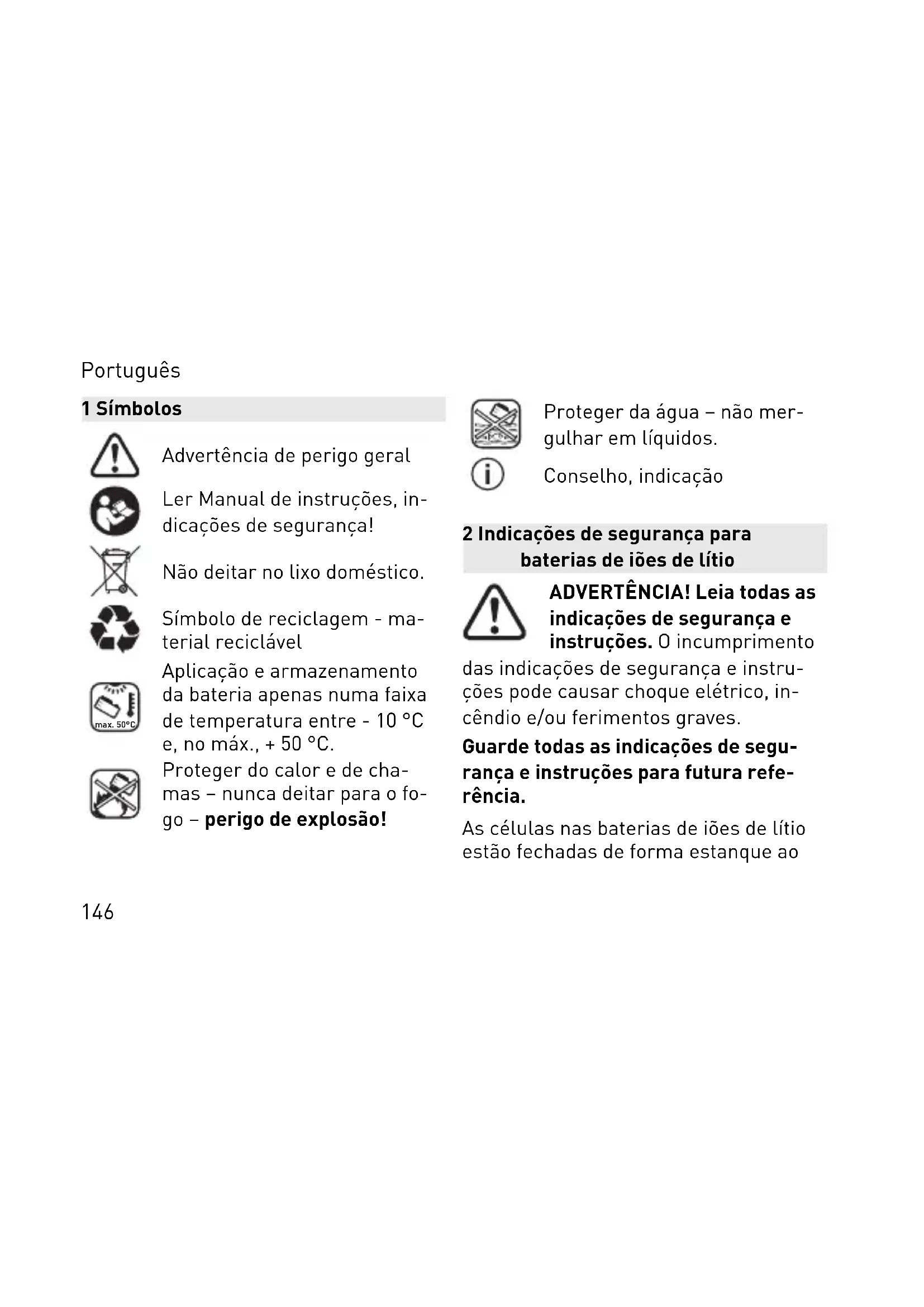 manuseamento ideal da bateria A bateria é fornecida com carga parcial. Para garantir a potência total da bateria, carregar com pletamente a bateria no carre gador antes da primeira utiliza ção. A bateria pode ser carregada a qual quer momento, sem reduzir a sua vida útil. Uma interrupção do processo de carga não danifica a bateria. Após uma desativação auto mática da ferramenta elétri ca, não premir novamente o interruptor de ativação/desativação. A bateria pode ficar danificada. A bateria está equipada com um contro lo térmico, que apenas permite o carre gamento numa faixa de temperatura entre 0 °C e 55 °C. Desta forma, alcan ça-se uma longa vida útil da bateria. – Armazenar a bateria, em ambientes o mais frescos (5 °C a 25 °C) e secos (humidade do ar < 80%) possível. Português 151– P. ex., no verão, não deixar a bateria no carro. – Um tempo de funcionamento nitida mente mais curto após o carrega mento indica que a bateria está gasta e tem de ser substituída. – Respeitar as indicações relativas à eliminação.