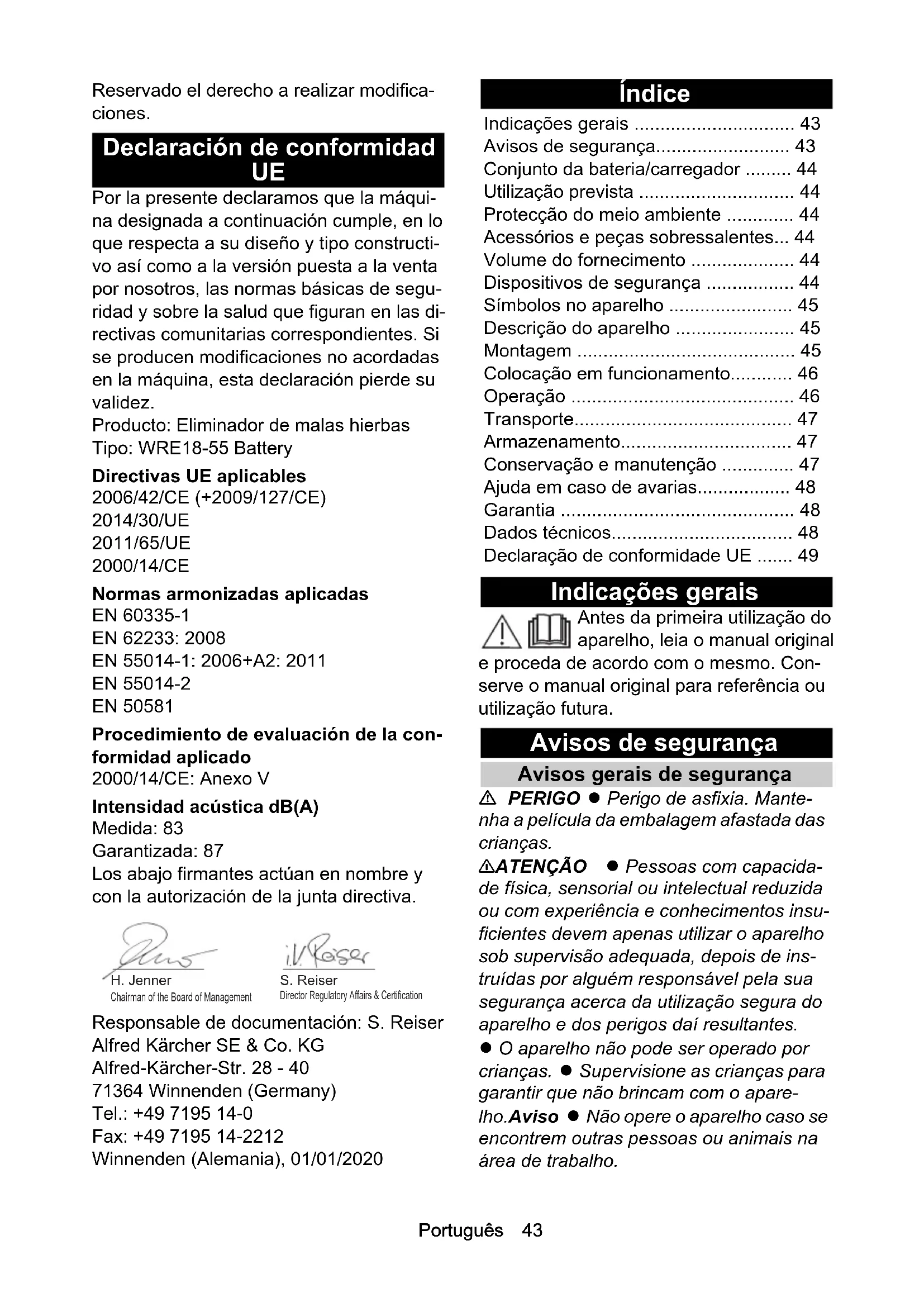 • Por la presente declaramos que la máqui- na designada a continuación cumple, en lo que respecta a su diseño y tipo constructi- vo así como a la versión puesta a la venta por nosotros, las normas básicas de segu- ridad y sobre la salud que figuran en las di- rectivas comunitarias correspondientes. Si se producen modificaciones no acordadas en la máquina, esta declaración pierde su validez. Producto: Eliminador de malas hierbas Tipo: WRE18-55 Battery Directivas UE aplicables 2006/42/CE (+2009/127/CE) 2014/30/UE 2011/65/UE 2000/14/CE Normas armonizadas aplicadas EN 60335-1 EN 62233: 2008 EN 55014-1: 2006+A2: 2011 EN 55014-2 EN 50581 Procedimiento de evaluación de la con- formidad aplicado 2000/14/CE: Anexo V Intensidad acústica dB(A) Medida: 83 Garantizada: 87 Los abajo firmantes actúan en nombre y con la autorización de la junta directiva. Responsable de documentación: S. Reiser Alfred Kärcher SE & Co. KG Alfred-Kärcher-Str. 28 - 40 71364 Winnenden (Germany) Tel.: +49 7195 14-0 Fax: +49 7195 14-2212 Winnenden (Alemania), 01/01/2020 Índice Indicações gerais Antes da primeira utilização do aparelho, leia o manual original e proceda de acordo com o mesmo. Con- serve o manual original para referência ou utilização futura. Avisos de segurança Avisos gerais de segurança PERIGO ● Perigo de asfixia. Mante- nha a película da embalagem afastada das crianças. 몇 ATENÇÃO ● Pessoas com capacida- de física, sensorial ou intelectual reduzida ou com experiência e conhecimentos insu- ficientes devem apenas utilizar o aparelho sob supervisão adequada, depois de ins- truídas por alguém responsável pela sua segurança acerca da utilização segura do aparelho e dos perigos daí resultantes. ● O aparelho não pode ser operado por crianças. ● Supervisione as crianças para garantir que não brincam com o apare- lho.Aviso ● Não opere o aparelho caso se encontrem outras pessoas ou animais na área de trabalho. Chairman of the Board of Management Director Regulatory Affairs & Certification H. Jenner S. Reiser Indicações gerais p. 43