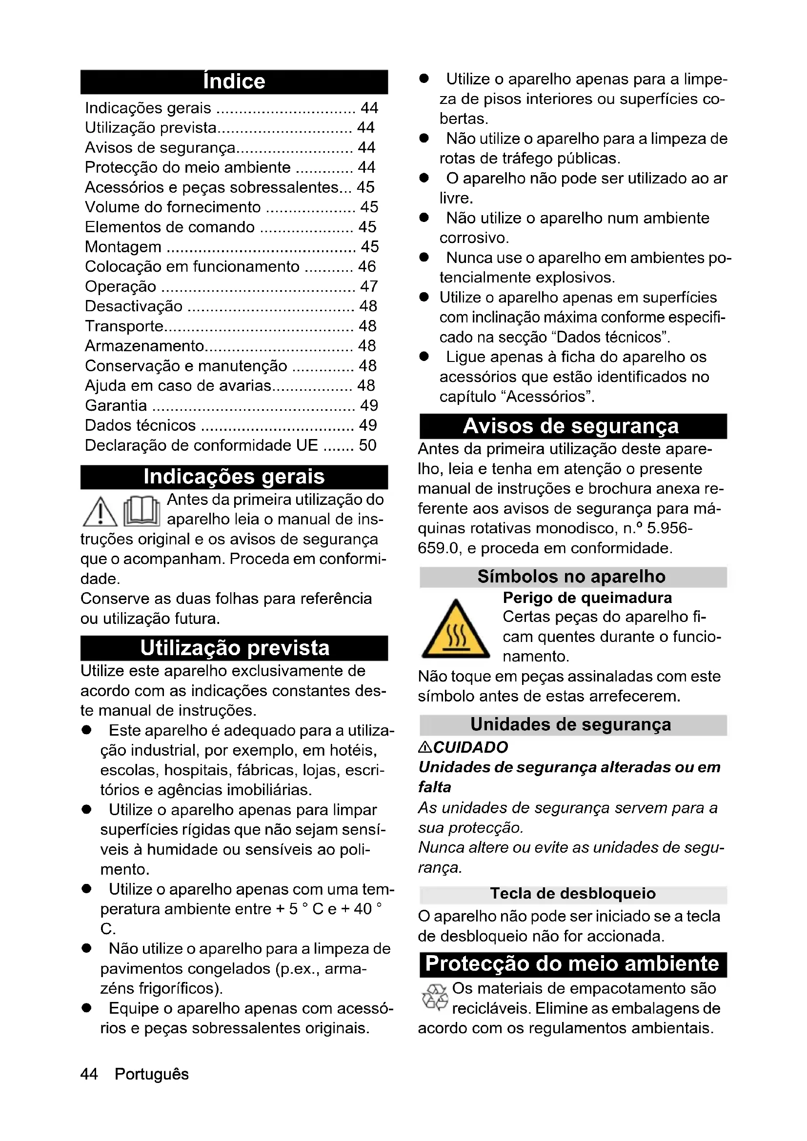 • Utilize o aparelho apenas em superfícies com inclinação máxima conforme especifi- cado na secção “Dados técnicos”. Ligue apenas à ficha do aparelho os acessórios que estão identificados no capítulo “Acessórios”. Avisos de segurança Antes da primeira utilização deste apare- lho, leia e tenha em atenção o presente manual de instruções e brochura anexa re- ferente aos avisos de segurança para má- quinas rotativas monodisco, n.º 5.956- 659.0, e proceda em conformidade. Símbolos no aparelho Perigo de queimadura Certas peças do aparelho fi- cam quentes durante o funcio- namento. Não toque em peças assinaladas com este símbolo antes de estas arrefecerem. Unidades de segurança 몇 CUIDADO Unidades de segurança alteradas ou em falta As unidades de segurança servem para a sua protecção. Nunca altere ou evite as unidades de segu- rança. Tecla de desbloqueio O aparelho não pode ser iniciado se a tecla de desbloqueio não for accionada. Protecção do meio ambiente Os materiais de empacotamento são recicláveis. Elimine as embalagens de acordo com os regulamentos ambientais. Indicações gerais p. 44