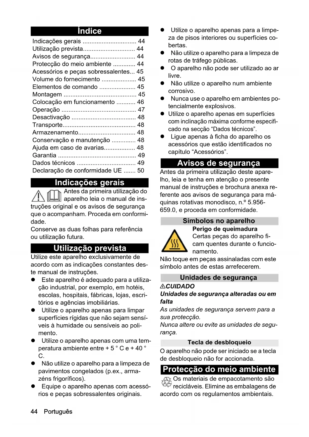 - Utilize o aparelho apenas em superfícies com inclinação máxima conforme especifi- cado na secção “Dados técnicos”. Ligue apenas à ficha do aparelho os acessórios que estão identificados no capítulo “Acessórios”. Avisos de segurança Antes da primeira utilização deste apare- lho, leia e tenha em atenção o presente manual de instruções e brochura anexa re- ferente aos avisos de segurança para má- quinas rotativas monodisco, n.º 5.956- 659.0, e proceda em conformidade. Símbolos no aparelho Perigo de queimadura Certas peças do aparelho fi- cam quentes durante o funcio- namento. Não toque em peças assinaladas com este símbolo antes de estas arrefecerem. Unidades de segurança 몇 CUIDADO Unidades de segurança alteradas ou em falta As unidades de segurança servem para a sua protecção. Nunca altere ou evite as unidades de segu- rança. Tecla de desbloqueio O aparelho não pode ser iniciado se a tecla de desbloqueio não for accionada. Protecção do meio ambiente Os materiais de empacotamento são recicláveis. Elimine as embalagens de acordo com os regulamentos ambientais. Indicações gerais p. 44