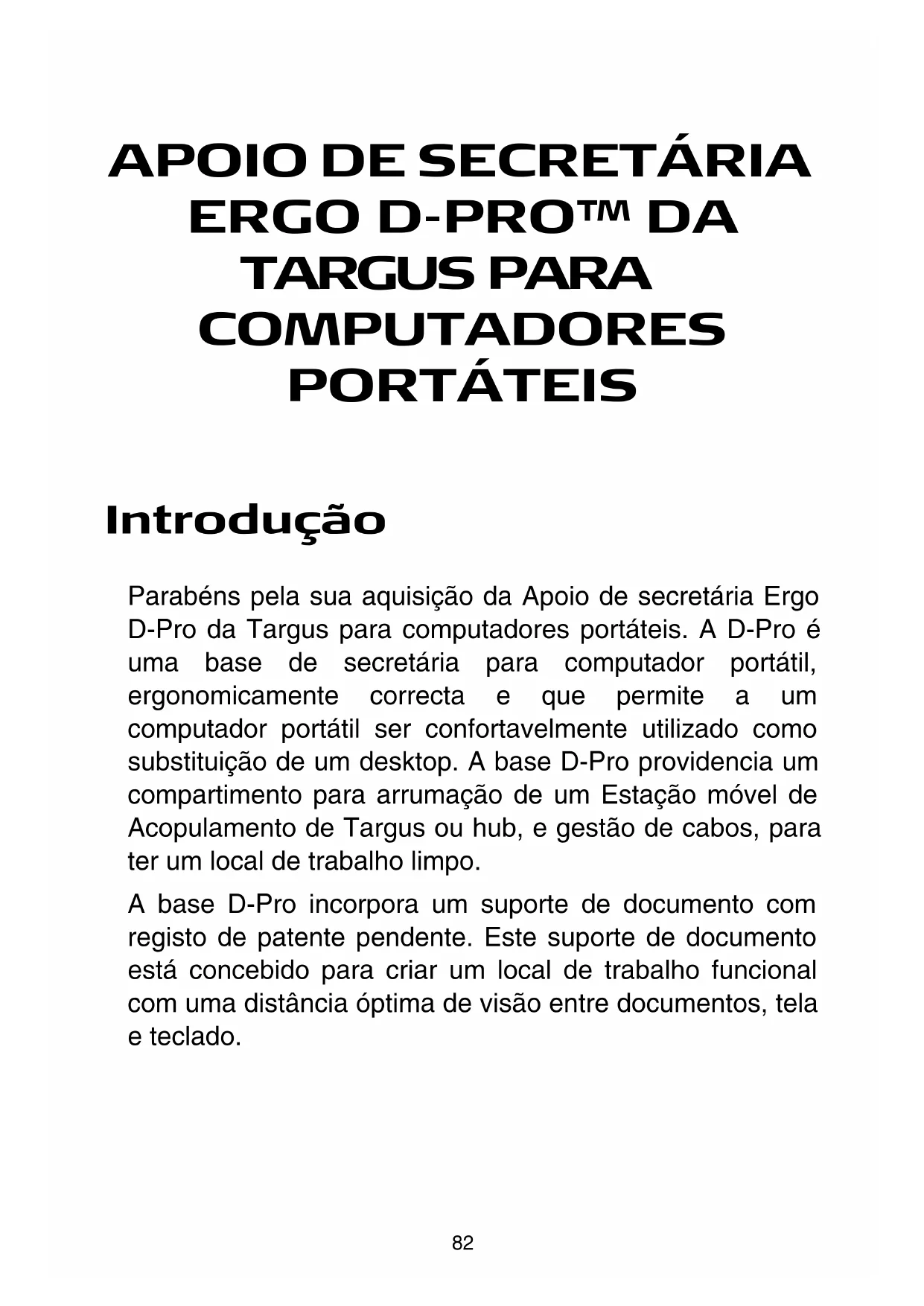 Parabéns pela sua aquisicao da Apoio de secretaria Ergo D-Pro da Targus para computadores portateurs. A D-Pro é uma base de secretaria para computador portálil, ergonomically correcta e que permite a um computador portátil ser comfortavelmenteutilizando como substituição de um desktop. A base D-Pro providencia um compartmento para arrumaçao de um Estado maisvel de Acopulamento de Targus ou hub, e gestao de cabos, para ter um local de trabalho limpo.