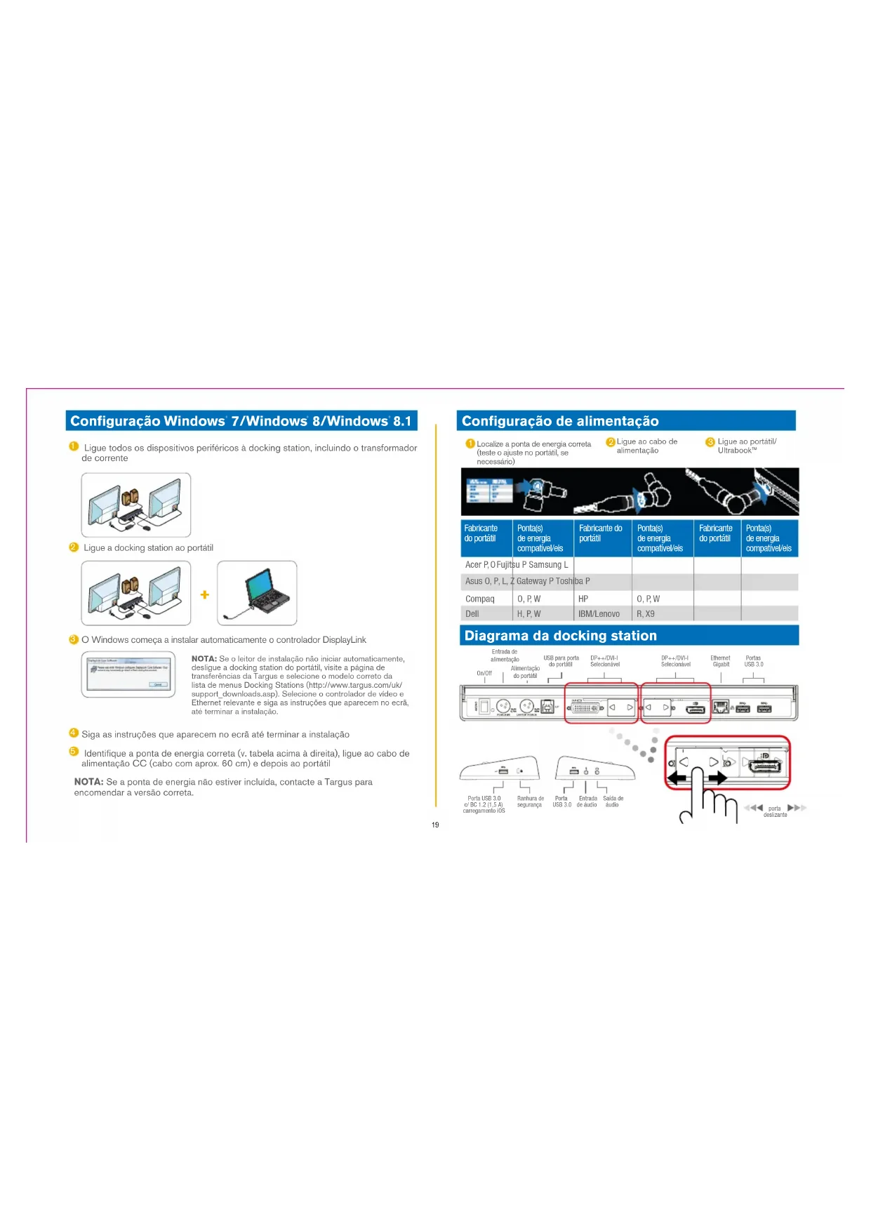 Localize a ponta de energia correta (teste o ajuste no portátil, se necessário) Ligue ao cabo de alimentação Ligue ao portátil/ Ultrabook™ Fabricante do portátil Ponta(s) de energia compatível/eis Fabricante do portátil Ponta(s) de energia compatível/eis Fabricante do portátil Ponta(s) de energia compatível/eis Acer P, O Fujitsu P Samsung L Asus O, P, L, Z Gateway P Toshiba P Compaq O, P, W HP O, P, W Dell H, P, W IBM/Lenovo R, X9 On/OffUSB para porta do portátilPortas USB 3.0Entrada de alimentaçãoAlimentação do portátilEthernet GigabitDP++/DVI-ISelecionávelDP++/DVI-ISelecionável Entrada de áudioPorta USB 3.0Saída de áudioporta deslizanteRanhura de segurançaPorta USB 3.0c/ BC 1.2 (1,5 A)carregamento iOSNOTA: Se o leitor de instalação não iniciar automaticamente, desligue a docking station do portátil, visite a página de transferências da Targus e selecione o modelo correto da lista de menus Docking Stations (http://www.targus.com/uk/support_downloads.asp). Selecione o controlador de vídeo e Ethernet relevante e siga as instruções que aparecem no ecrã, até terminar a instalação.