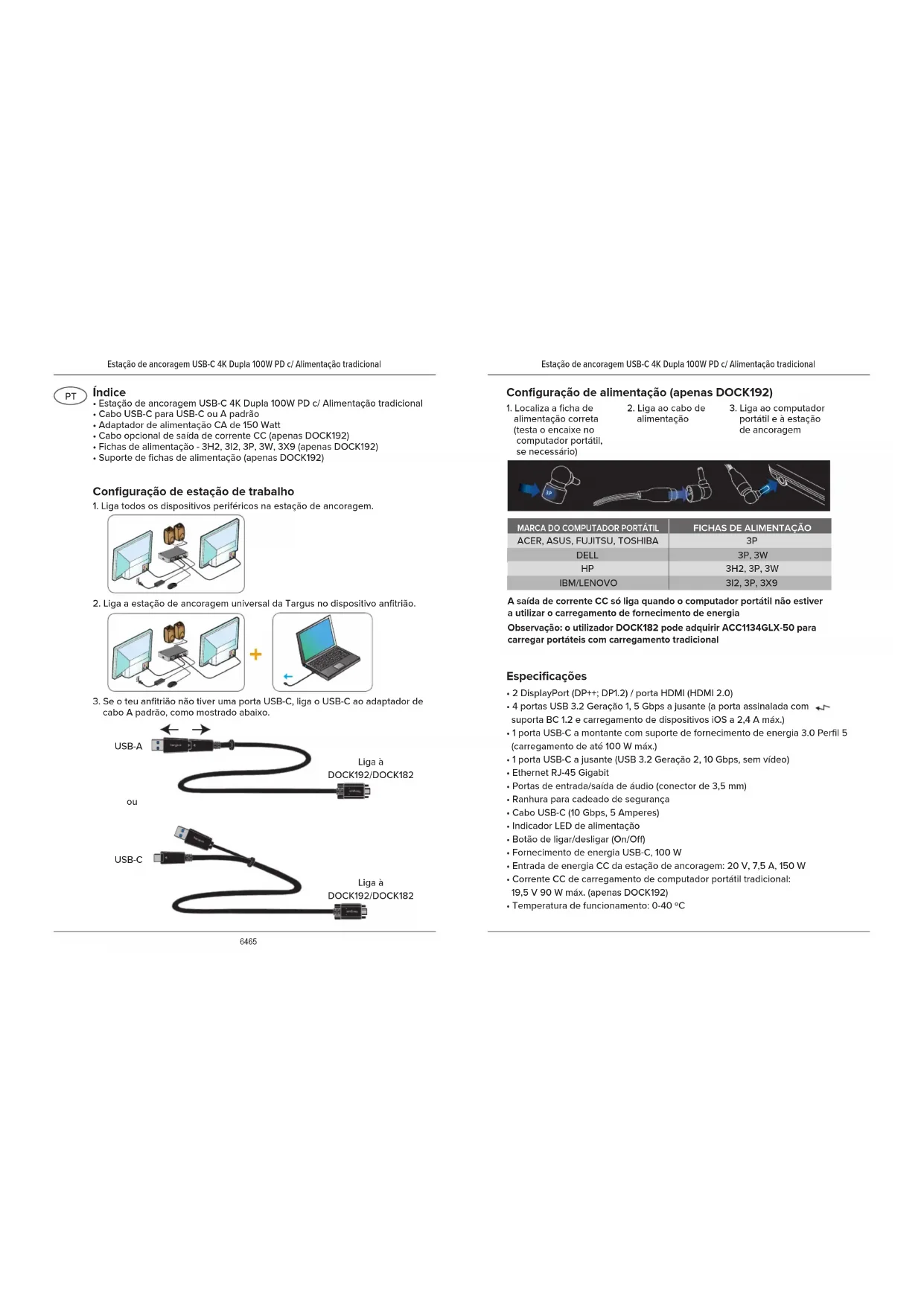 - Corrente CC de carregamento de computador portátil tradicional: 19,5 V 90 W máx. (apenas DOCK192)