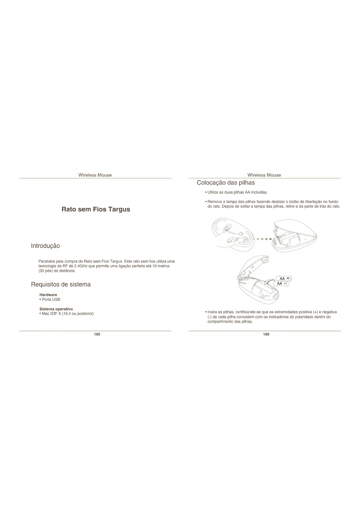 Rato sem Fios Targus Parabéns pela compra do Rato sem Fios Targus. Este rato sem fios utiliza uma tecnologia de RF de 2.4GHz que permite uma ligação perfeita até 10 metros (33 pés) de distância. Introdução Requisitos de sistema Hardware