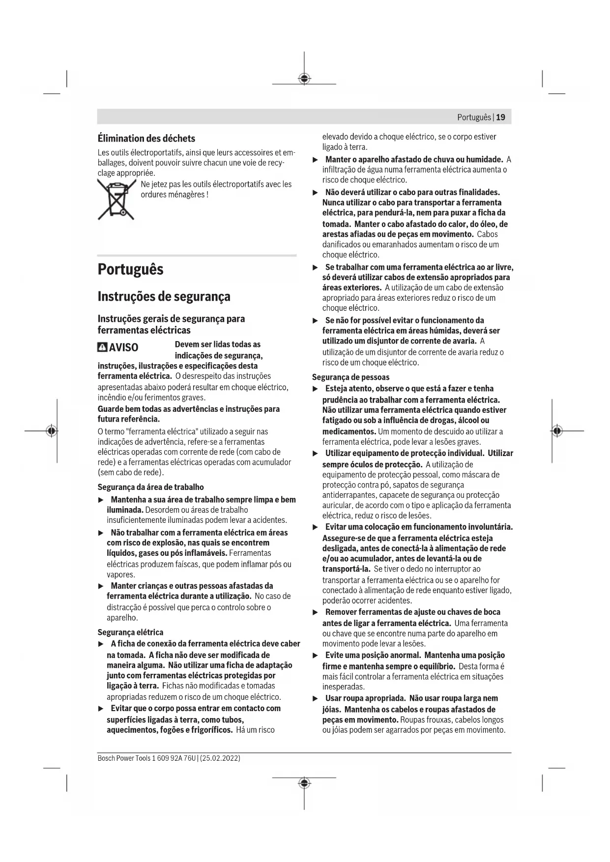 (2608000766) – Para a aplicação universal em superfícies planas e abauladas – O conjunto é composto por uma prato de lixar macio e um estofo intermédio (2608000765). O prato de lixar só pode ser utilizado com o estofo intermédio. Prato de lixar de dureza média (2608000764) – Elevada capacidade de desbaste, ideal para reboco duro e remoção de tintas de parede antigas – Para a utilização em superfícies planas – O apoio de aspiração ideal facilita o trabalho na utilização de um aspirador. A) Volume de fornecimento padrão Trocar o estofo intermédio (verfiguraA) Na utilização do prato de lixar macio (volume de fornecimento padrão) tem de ser sempre utilizado um estofo intermédio(15). Para remover o estofo intermédio(15) levante-o lateralmente e retire-o para fora do prato de lixar(17). Bosch Power Tools 1 609 92A 76U | (25.02.2022)22 | Português Antes de colocar um estofo intermédio novo, remova a sujidade e o pó do prato de lixar(17), p. ex. com um pincel. A superfície do prato de lixar(17) é feita de um tecido de velcro, para que possa fixar de forma rápida e fácil o estofo intermédio. Pressione bem o estofo intermédio(15) no lado de baixo do prato de lixar(17). Para garantir uma aspiração de pó ideal, certifique-se de que os furos do estofo intermédio(15) coincidem com os furos no prato de lixar(17). Substituir prato de lixar (verfiguraB) Nota: substitua de imediato um prato de lixar (17) danificado. Retire o disco de lixar(14) e o estofo intermédio(15). Desenrosque totalmente o parafuso (16) e retire o prato de lixar (17). Coloque o novo prato de lixar (17) e aperte novamente o parafuso. Nota: ao colocar o prato de lixar, certifique-se de que os dentes do arrastador encaixam nos entalhes do prato de lixar. Nota: um suporte do prato de lixar danificado só pode ser substituído por um posto de assistência técnica autorizado para ferramentas elétricas Bosch. Colocar/retirar o tubo de extensão (verfigurasC−D) Utilize os tubos de extensão(10) apenas se necessário: ao trabalhar sem tubo de extensão, o esforço necessário para o lixamento é claramente reduzido. Nota: só podem ser usados no máximo 2tubos de extensão. Soltar a ligação entre a cabeça de lixar/peça de agarrar/ tubo de extensão (verfiguraC): – ➊ Abra a alavanca tensora(9). – ➋ Abra o gancho de retenção(8). – ➌ Separe as peças ligadas até ao momento. Fechar a ligação entre a cabeça de lixar/peça de agarrar/ tubo de extensão (verfiguraD): – ➍ Consoante a ligação desejada, encaixe a cabeça de lixar(11), peça de agarrar(7) ou tubos de extensão(10). – ➎ Fecha o gancho de retenção(8). – ➏ Pressione a alavanca tensora(9), de modo a que fique em ângulo reto em relação à cabeça de lixar(11), peça de agarrar(7) ou tubo de extensão(10). – ➐ Aperte bem o parafuso excêntrico(21). – ➑ Feche a alavanca tensora(9). Verifique sempre se todas as peças de união estão seguras e bem unidas com o gancho de retenção(8) e as alavancas tensoras(9). Aspiração de pó/de aparas Os pós dos materiais podem ser prejudiciais para a saúde. O contacto ou a inalação de pós pode provocar reações alérgicas e/ou doenças nas vias respiratórias do utilizador ou das pessoas que se encontrem por perto. Determinados pós são considerados cancerígenos. – Se possível deverá usar uma aspiração de pó apropriada para o material. – Assegure uma boa ventilação do local de trabalho. – Use sempre uma máscara de proteção respiratória com classe de filtro P2. Aspiração externa Encaixe a mangueira de aspiração(5) no bocal de sopro(6) na peça de agarrar(7). Ligue a mangueira de aspiração (5) a um aspirador (acessório). O aspirador de pó deve ser apropriado para o material a ser trabalhado. Utilize um aspirador especial para aspirar pó que seja extremamente nocivo à saúde, cancerígeno ou seco. Para grandes superfícies use o aspirador GAS35L/MAFC ou GAS55L/MAFC, uma vez que estes garantem a potência de aspiração contínua necessária. Ao trabalhar em superfícies verticais, segure a ferramenta elétrica de modo a que a mangueira de aspiração aponte para baixo. Montar/desmontar o clipe da mangueira/cabo (verfiguraE) Vire o clipe da mangueira/cabo(22) sobre a mangueira de aspiração(5). Insira o cabo de rede na ranhura para cabos do clipe da mangueira/cabo. Para a desmontagem, retire o clipe da mangueira/cabo(22) da mangueira de aspiração(5) e retire o cabo de rede do clipe da mangueira/cabo. Funcionamento Colocação em funcionamento u Observar a tensão de rede! A tensão da fonte de corrente elétrica deve coincidir com os dados que constam na placa de características da ferramenta elétrica. Ferramentas elétricas marcadas para 230V também podem ser operadas com 220V. Pré-selecionar o número de rotações Com a roda para pré-seleção da velocidade de rotação(2) pode pré-selecionar o número de rotações necessário mesmo durante a operação. Números mais altos significam um número de rotações maior, números mais baixos um número de rotações menor. A Constant-Electronic mantém o número de rotações durante a marcha em vazio e sob carga quase que constante e assegura um desempenho de trabalho uniforme. O arranque suave eletrónico limita o binário ao ligar e aumenta a durabilidade do motor. Ligar/desligar u Certifique-se de que consegue acionar o interruptor de ligar/desligar sem ter de soltar o punho. 1 609 92A 76U | (25.02.2022) Bosch Power ToolsPortuguês | 23 Para ligar a ferramenta elétrica, empurre o interruptor de ligar/desligar(3) para a frente, para que apareça no interruptor "I". Para desligar a ferramenta elétrica, empurre o interruptor de ligar/desligar(3) para cima, para que apareça no interruptor "0". Vista geral de aplicação Betume/ dureza do gesso Parede/ teto Fluxo de ar interior/exterior Potência de aspiração Nível de rotações Grão Disco de lixar Muito macio/