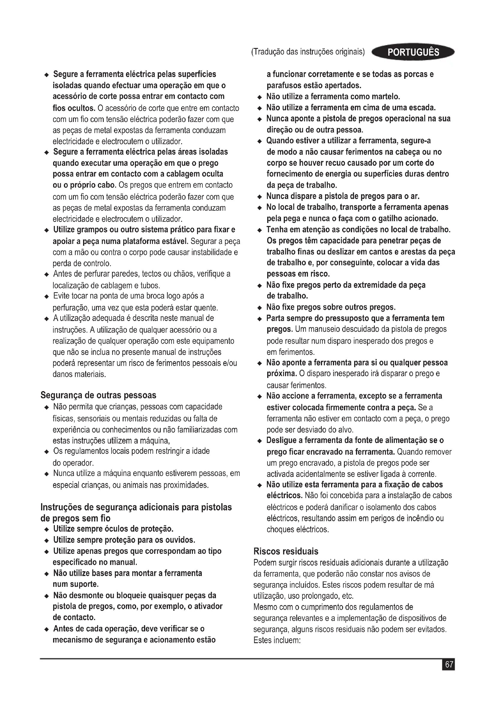 a. A sua ferramenta eléctrica só deve ser reparada por um técnico qualicado e só devem ser utilizadas peças sobresselentes originais. Desta forma, é garantida a segurança da ferramenta eléctrica. b. Nunca repare BATERIAS danicadas. A reparação de BATERIAS danicadas só deve ser efectuada pelo fabricante ou por fornecedores de serviços autorizados. Avisos de segurança adicionais relativos a ferramentas eléctricas u Utilize os punhos auxiliares fornecidos com a ferramenta. A perda de controlo pode causar lesões pessoais.67 (Tradução das instruções originais) PORTUGUÊS u Segure a ferramenta eléctrica pelas superfícies isoladas quando efectuar uma operação em que o acessório de corte possa entrar em contacto com os ocultos. O acessório de corte que entre em contacto com um o com tensão eléctrica poderão fazer com que as peças de metal expostas da ferramenta conduzam electricidade e electrocutem o utilizador. u Segure a ferramenta eléctrica pelas áreas isoladas quando executar uma operação em que o prego possa entrar em contacto com a cablagem oculta ou o próprio cabo. Os pregos que entrem em contacto com um o com tensão eléctrica poderão fazer com que as peças de metal expostas da ferramenta conduzam electricidade e electrocutem o utilizador. u Utilize grampos ou outro sistema prático para xar e apoiar a peça numa plataforma estável. Segurar a peça com a mão ou contra o corpo pode causar instabilidade e perda de controlo. u Antes de perfurar paredes, tectos ou chãos, verique a localização de cablagem e tubos. u Evite tocar na ponta de uma broca logo após a perfuração, uma vez que esta poderá estar quente. u A utilização adequada é descrita neste manual de instruções. A utilização de qualquer acessório ou a realização de qualquer operação com este equipamento que não se inclua no presente manual de instruções poderá representar um risco de ferimentos pessoais e/ou danos materiais. Segurança de outras pessoas u Não permita que crianças, pessoas com capacidade físicas, sensoriais ou mentais reduzidas ou falta de experiência ou conhecimentos ou não familiarizadas com estas instruções utilizem a máquina, u Os regulamentos locais podem restringir a idade do operador. u Nunca utilize a máquina enquanto estiverem pessoas, em especial crianças, ou animais nas proximidades. Instruções de segurança adicionais para pistolas de pregos sem o u Utilize sempre óculos de proteção. u Utilize sempre proteção para os ouvidos. u Utilize apenas pregos que correspondam ao tipo especicado no manual. u Não utilize bases para montar a ferramenta num suporte. u Não desmonte ou bloqueie quaisquer peças da pistola de pregos, como, por exemplo, o ativador de contacto. u Antes de cada operação, deve vericar se o mecanismo de segurança e acionamento estão a funcionar corretamente e se todas as porcas e parafusos estão apertados. u Não utilize a ferramenta como martelo. u Não utilize a ferramenta em cima de uma escada. u Nunca aponte a pistola de pregos operacional na sua direção ou de outra pessoa. u Quando estiver a utilizar a ferramenta, segure-a de modo a não causar ferimentos na cabeça ou no corpo se houver recuo causado por um corte do fornecimento de energia ou superfícies duras dentro da peça de trabalho. u Nunca dispare a pistola de pregos para o ar. u No local de trabalho, transporte a ferramenta apenas pela pega e nunca o faça com o gatilho acionado. u Tenha em atenção as condições no local de trabalho. Os pregos têm capacidade para penetrar peças de trabalho nas ou deslizar em cantos e arestas da peça de trabalho e, por conseguinte, colocar a vida das pessoas em risco. u Não xe pregos perto da extremidade da peça de trabalho. u Não xe pregos sobre outros pregos. u Parta sempre do pressuposto que a ferramenta tem pregos. Um manuseio descuidado da pistola de pregos pode resultar num disparo inesperado dos pregos e em ferimentos. u Não aponte a ferramenta para si ou qualquer pessoa próxima. O disparo inesperado irá disparar o prego e causar ferimentos. u Não accione a ferramenta, excepto se a ferramenta estiver colocada rmemente contra a peça. Se a ferramenta não estiver em contacto com a peça, o prego pode ser desviado do alvo. u Desligue a ferramenta da fonte de alimentação se o prego car encravado na ferramenta. Quando remover um prego encravado, a pistola de pregos pode ser activada acidentalmente se estiver ligada à corrente. u Não utilize esta ferramenta para a xação de cabos eléctricos. Não foi concebida para a instalação de cabos eléctricos e poderá danicar o isolamento dos cabos eléctricos, resultando assim em perigos de incêndio ou choques eléctricos. Riscos residuais Podem surgir riscos residuais adicionais durante a utilização da ferramenta, que poderão não constar nos avisos de segurança incluídos. Estes riscos podem resultar de má utilização, uso prolongado, etc. Mesmo com o cumprimento dos regulamentos de segurança relevantes e a implementação de dispositivos de segurança, alguns riscos residuais não podem ser evitados. Estes incluem:68 (Tradução das instruções originais) PORTUGUÊS u Ferimentos causados se tocar nas partes rotativas móveis. u Ferimentos causados quando substituir as peças, lâminas ou acessórios. u Ferimentos causados por utilização prolongada da ferramenta. Quando utilizar uma ferramenta durante períodos prolongados, certique-se de que faz pausas regularmente. u Danos auditivos. u Perigos para a saúde causados pela inalação de pó produzido quando utiliza a ferramenta (por exemplo: trabalho com madeira, em especial carvalho, faia, bras de dimensão média). Vibração Os valores de emissão de vibração declarados na secção de dados técnicos e na declaração de conformidade foram medidos de acordo com o método de teste padrão fornecido pela EN60745 e podem ser utilizados para comparar ferramentas. O valor de emissão