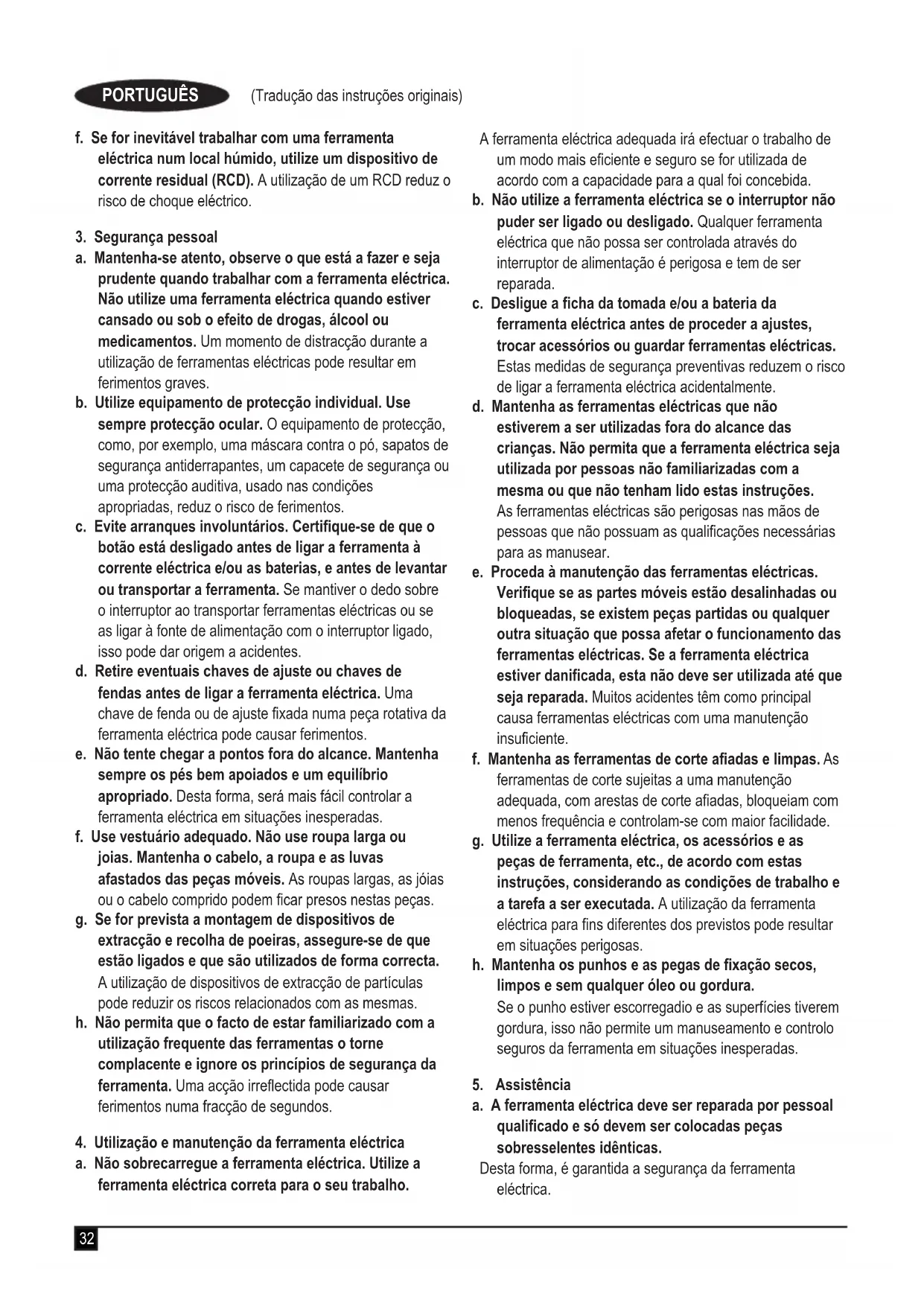 Atenção! Para reduzir o risco de ferimentos, o utilizador deve ler o manual de instruções.34 (Tradução das instruções originais) PORTUGUÊS Segurança eléctrica