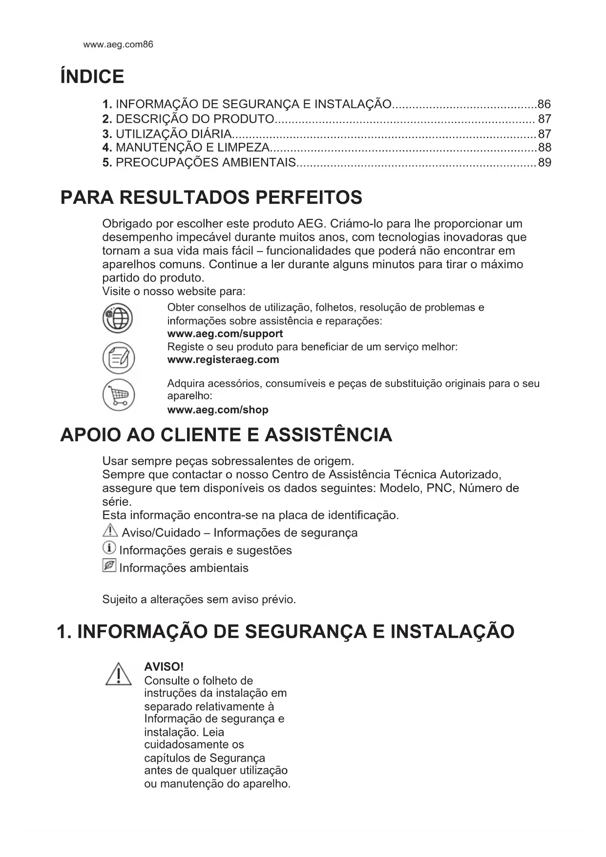 Obrigado por escolher este produto AEG. Criámo-lo para lhe proporcionar um desempenho impecável durante muitos anos, com tecnologias inovadoras que tornam a sua vida mais fácil – funcionalidades que poderá não encontrar em aparelhos comuns. Continue a ler durante alguns minutos para tirar o máximo partido do produto. Visite o nosso website para: Obter conselhos de utilização, folhetos, resolução de problemas e informações sobre assistência e reparações: www.aeg.com/support Registe o seu produto para beneficiar de um serviço melhor: www.registeraeg.com Adquira acessórios, consumíveis e peças de substituição originais para o seu aparelho: www.aeg.com/shop