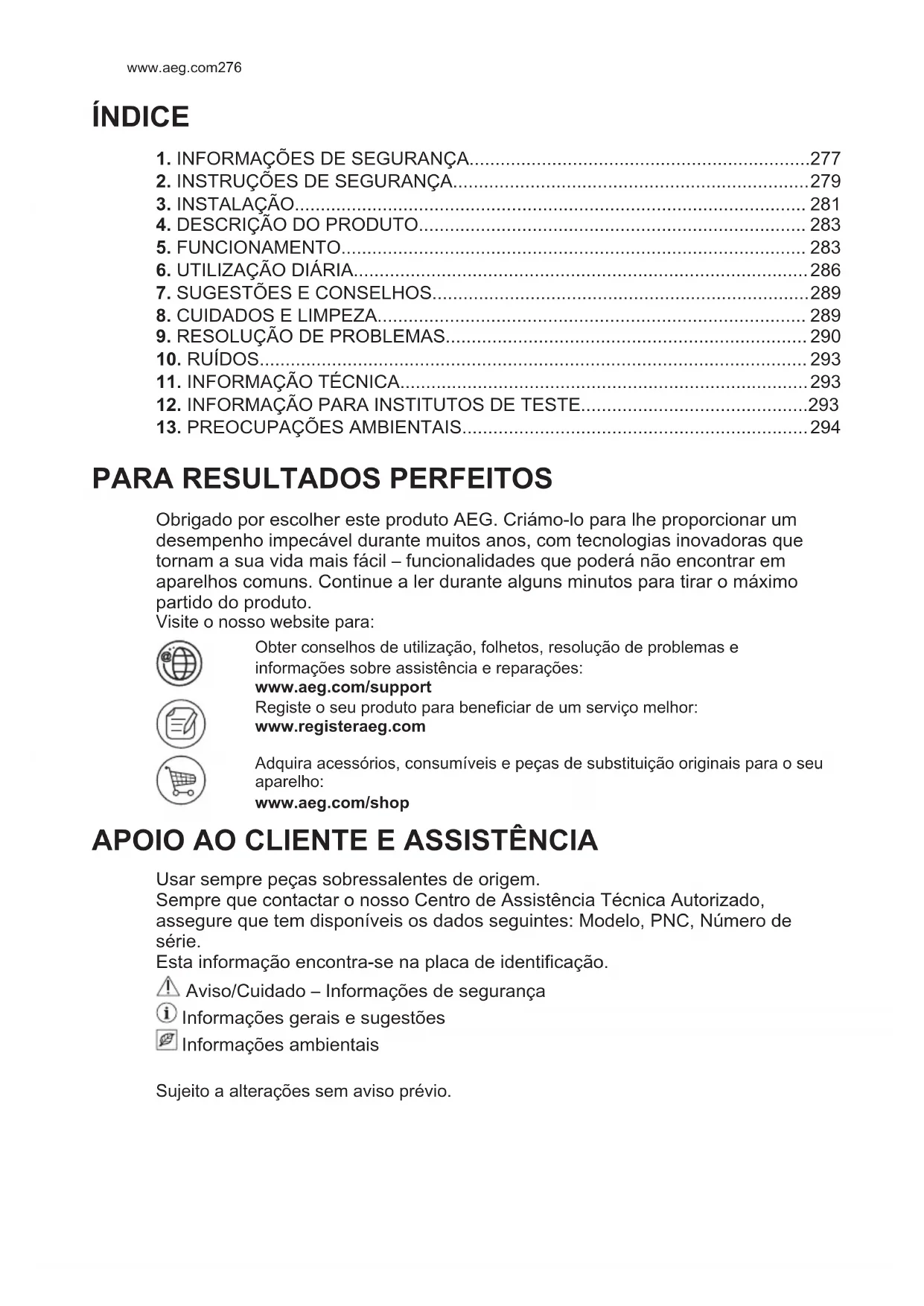 Usar sempre peças sobressalentes de origem. Sempre que contactar o nosso Centro de Assistência Técnica Autorizado, assegure que tem disponíveis os dados seguintes: Modelo, PNC, Número de série. Esta informação encontra-se na placa de identificação. Aviso/Cuidado – Informações de segurança Informações gerais e sugestões Informações ambientais Sujeito a alterações sem aviso prévio. www.aeg.com2761. INFORMAÇÕES DE SEGURANÇA Leia atentamente as instruções fornecidas antes de instalar e utilizar o aparelho. O fabricante não poderá ser responsabilizado por ferimentos ou danos resultantes de instalação incorreta ou utilização incorreta. Guarde sempre as instruções num sítio seguro e acessível para consultar no futuro.