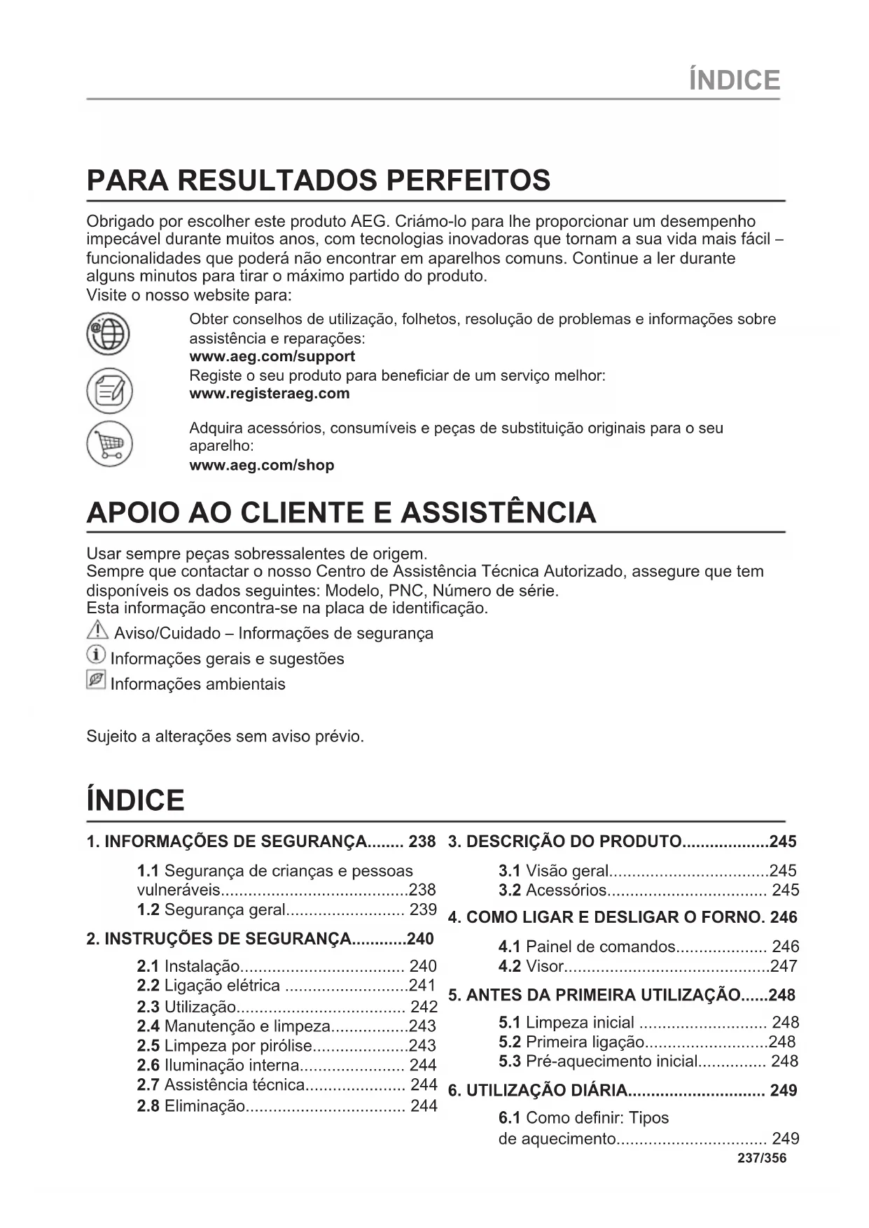 Obrigado por escolher este produto AEG. Criámo-lo para lhe proporcionar um desempenho impecável durante muitos anos, com tecnologias inovadoras que tornam a sua vida mais fácil – funcionalidades que poderá não encontrar em aparelhos comuns. Continue a ler durante alguns minutos para tirar o máximo partido do produto. Visite o nosso website para: Obter conselhos de utilização, folhetos, resolução de problemas e informações sobre assistência e reparações: www.aeg.com/support Registe o seu produto para beneficiar de um serviço melhor: www.registeraeg.com Adquira acessórios, consumíveis e peças de substituição originais para o seu aparelho: www.aeg.com/shop