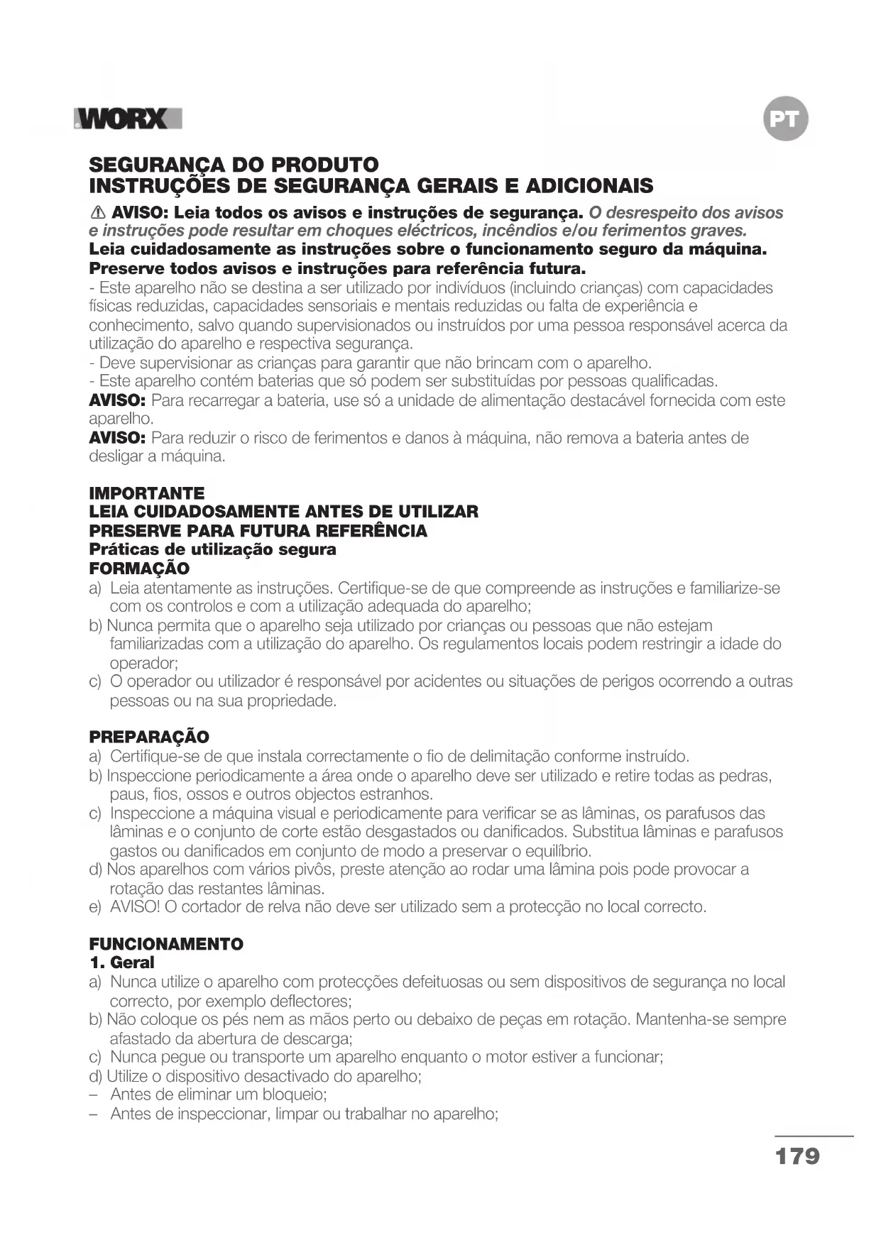 instruções e utilize o procedimento de carga correto. j) Não mantenha a bateria a carregar quando não for utilizada. k) Após longos períodos de tempos de armazenamento, pode ser necessário carregar e descarregar a bateria diversas vezes para obter o desempenho máximo. l) Recarregue apenas com o carregador especificado pela Worx. Não utilize um carregador que não se encontra especificado para a utilização com o equipamento. m) Não utilize uma bateria que não se encontra concebida para a utilização com o equipamento. n) Mantenha a bateria fora do alcance das crianças. o) Preserve as informações originais do produto para futura referência. p) Retire a bateria do equipamento quando não estiver em utilização. q) Elimine-a de forma adequada. r) Não misture pilhas de diferente fabrico, capacidade, tamanho ou tipo num dispositivo. s) Não remova a bateria da respetiva embalagem original até ser necessário para utilização. t) Observe as marcas de sinal positivo (+) e sinal negativo (–) na bateria e assegure a utilização correta.182