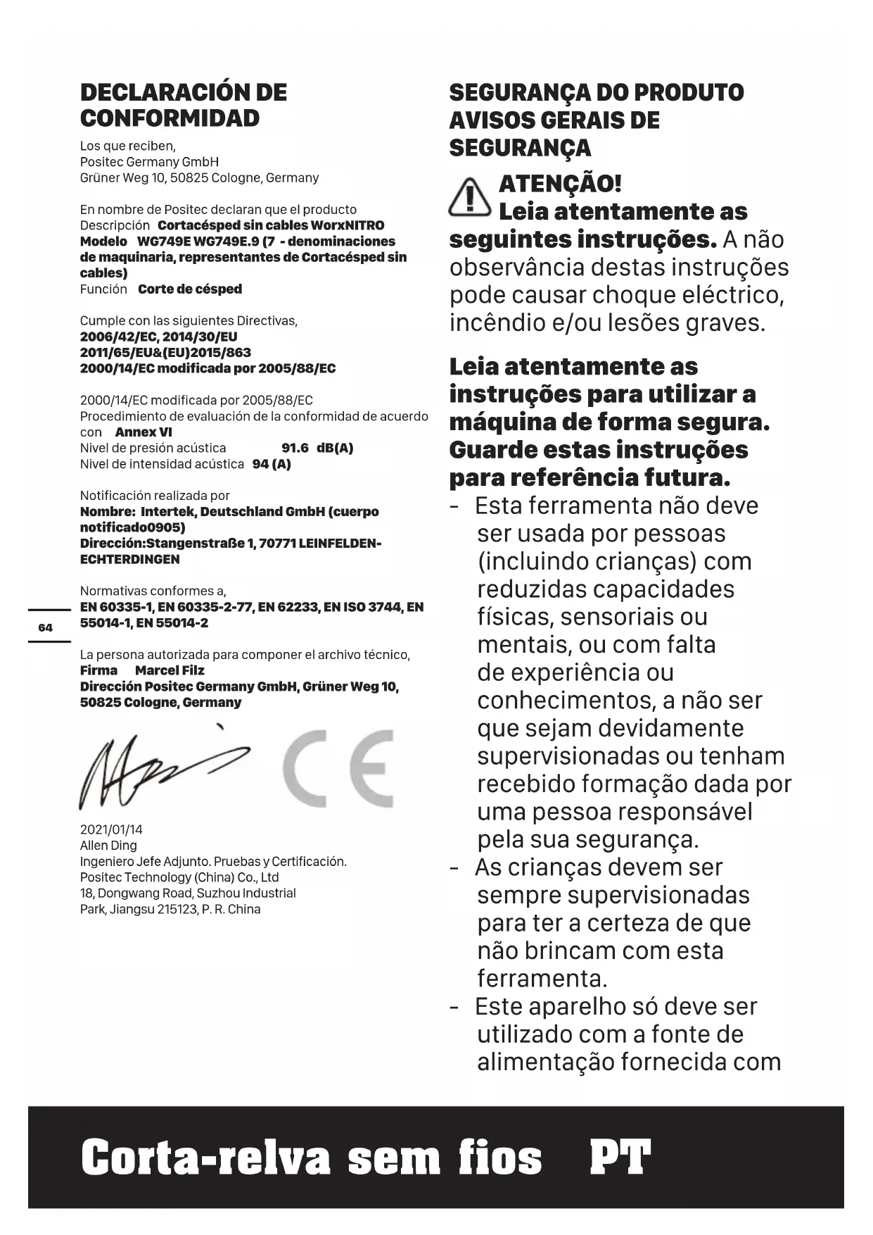 Baixe as instruções para o seu Corta-relva em formato PDF gratuitamente! Encontre o seu manual WG749E - WORX e retome o controlo do seu dispositivo eletrónico. Nesta página estão publicados todos os documentos necessários para a utilização do seu dispositivo. WG749E da marca WORX.