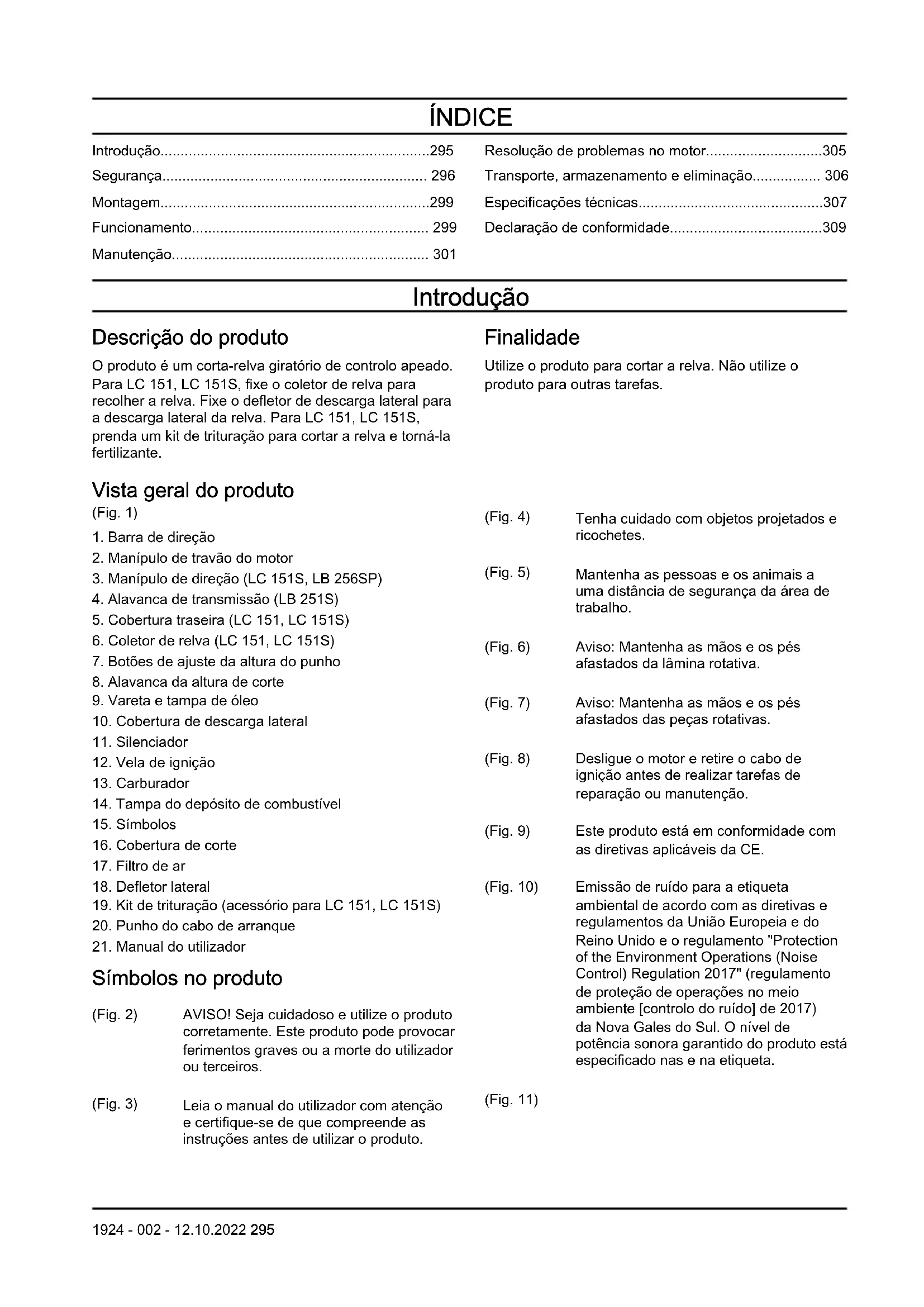 Símbolos no produto (Fig. 2) AVISO! Seja cuidadoso e utilize o produto corretamente. Este produto pode provocar ferimentos graves ou a morte do utilizador ou terceiros. (Fig. 3) Leia o manual do utilizador com atenção e certifique-se de que compreende as instruções antes de utilizar o produto. (Fig. 4) Tenha cuidado com objetos projetados e ricochetes. (Fig. 5) Mantenha as pessoas e os animais a uma distância de segurança da área de trabalho. (Fig. 6) Aviso: Mantenha as mãos e os pés afastados da lâmina rotativa. (Fig. 7) Aviso: Mantenha as mãos e os pés afastados das peças rotativas. (Fig. 8) Desligue o motor e retire o cabo de ignição antes de realizar tarefas de reparação ou manutenção. (Fig. 9) Este produto está em conformidade com as diretivas aplicáveis da CE. (Fig. 10) Emissão de ruído para a etiqueta ambiental de acordo com as diretivas e regulamentos da União Europeia e do Reino Unido e o regulamento "Protection of the Environment Operations (Noise Control) Regulation 2017" (regulamento de proteção de operações no meio ambiente [controlo do ruído] de 2017) da Nova Gales do Sul. O nível de potência sonora garantido do produto está especificado nas e na etiqueta. (Fig. 11) 1924 - 002 - 12.10.2022 295Este produto está em conformidade com os regulamento aplicáveis do Reino Unido. (Fig. 12) Risco de incêndio. (Fig. 13) Não respire os gases de escape. Os gases de escape do motor contêm monóxido de carbono, um gás inodoro, tóxico e altamente perigoso. Não ligue o motor em zonas interiores ou em espaços fechados. (Fig. 14) Superfície quente. (Fig. 15) Encha o motor com óleo an- tes de ligar o produto. Nota: Os restantes símbolos/autocolantes existentes no produto dizem respeito a requisitos para homologação em algumas áreas comerciais. Responsabilidade pelo produto Como referido nas leis de responsabilidade pelo produto, não somos responsáveis por danos causados pelo nosso produto se: