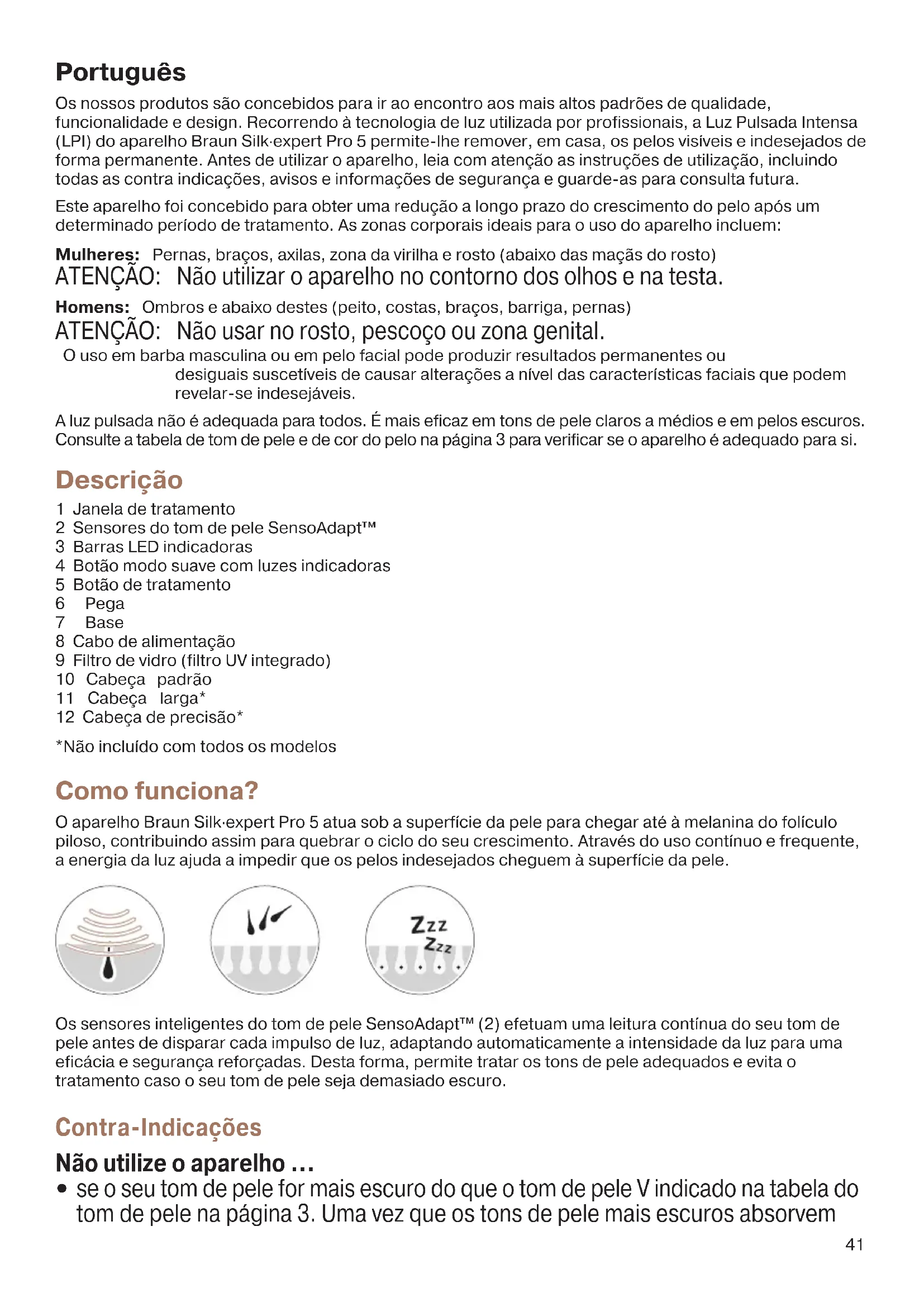 em pelos faciais/na barba no caso dos homens. Não se recomenda a utilização deste aparelho em zonas com preenchimento cutâneo. Não utilize mais do que uma vez por semana na mesma área. Podem ocorrer lesões na pele após o tratamento prolongado ou repetido no mesmo local. Segurança ocular Não olhe diretamente para o filtro de vidro (9) nem tente ativar o aparelho voltando-o na direção dos olhos. Para proteger os seus olhos e os das pessoas que estejam junto de si, o aparelho só se ativará quando os sensores do tom de pele estiverem em contacto com a pele. Se o aparelho se ativar quando os sensores NÃO estiverem em contacto com a pele, PARE o tratamento de imediato e contacte o seu revendedor. Possível lesão ocular (causando potencialmente perda de visão) ou lesão na pele, caso as indicações não sejam seguidas. Proteja os olhos da exposição. Não utilize o aparelho sobre as pestanas ou perto dos olhos. Precauções