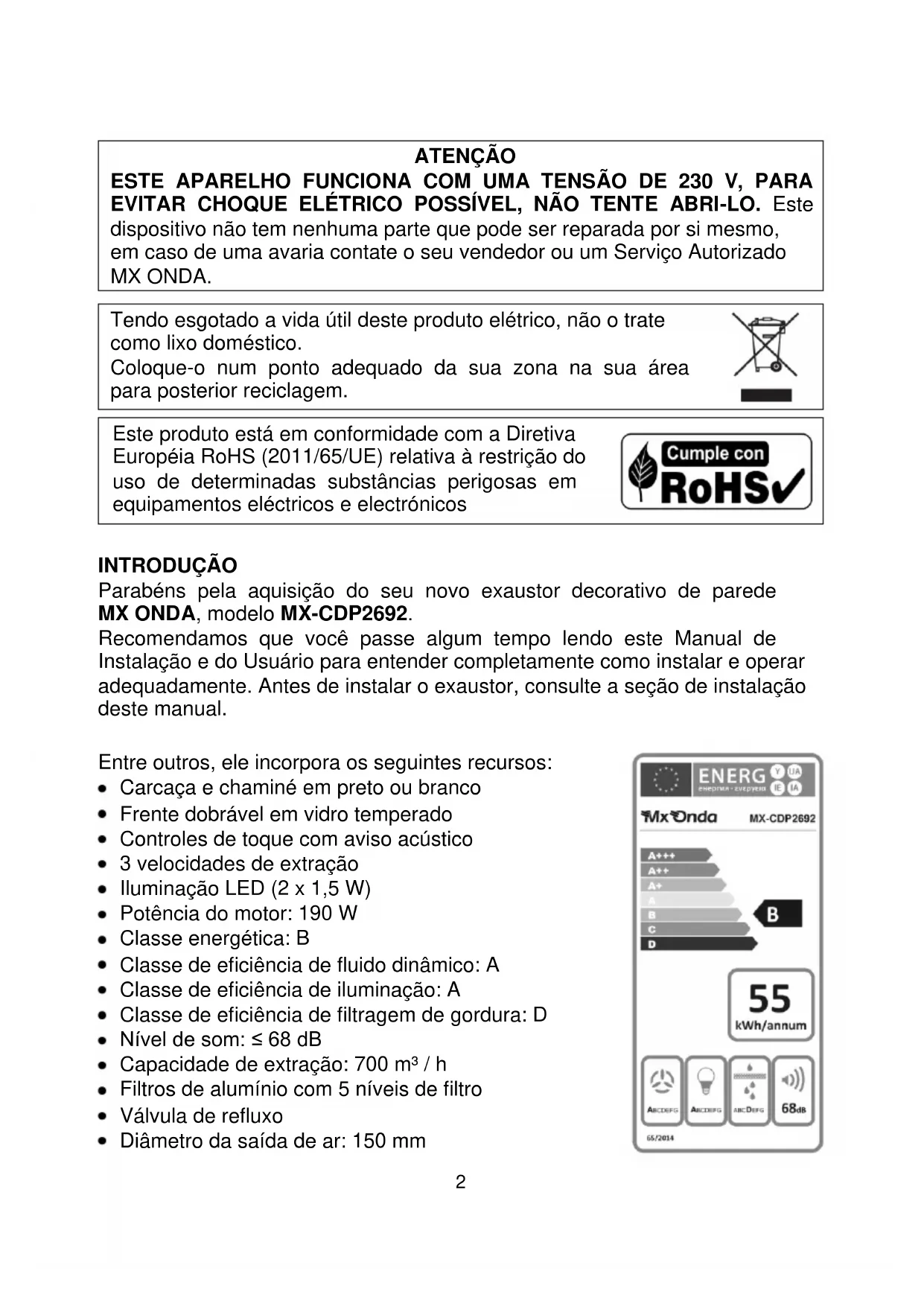 INTRODUÇÃO Parabéns pela aquisição do seu novo exaustor decorativo de parede MX ONDA, modelo MX-CDP2692. Recomendamos que você passe algum tempo lendo este Manual de Instalação e do Usuário para entender completamente como instalar e operar adequadamente. Antes de instalar o exaustor, consulte a seção de instalação deste manual. Entre outros, ele incorpora os seguintes recursos: Carcaça e chaminé em preto ou branco Frente dobrável em vidro temperado Controles de toque com aviso acústico 3 velocidades de extração Iluminação LED (2 x 1,5 W) Potência do motor: 190 W Classe energética: B Classe de eficiência de fluido dinâmico: A Classe de eficiência de iluminação: A Classe de eficiência de filtragem de gordura: D Nível de som: ≤ 68 dB Capacidade de extração: 700 m³ / h Filtros de alumínio com 5 níveis de filtro Válvula de refluxo Diâmetro da saída de ar: 150 mm3