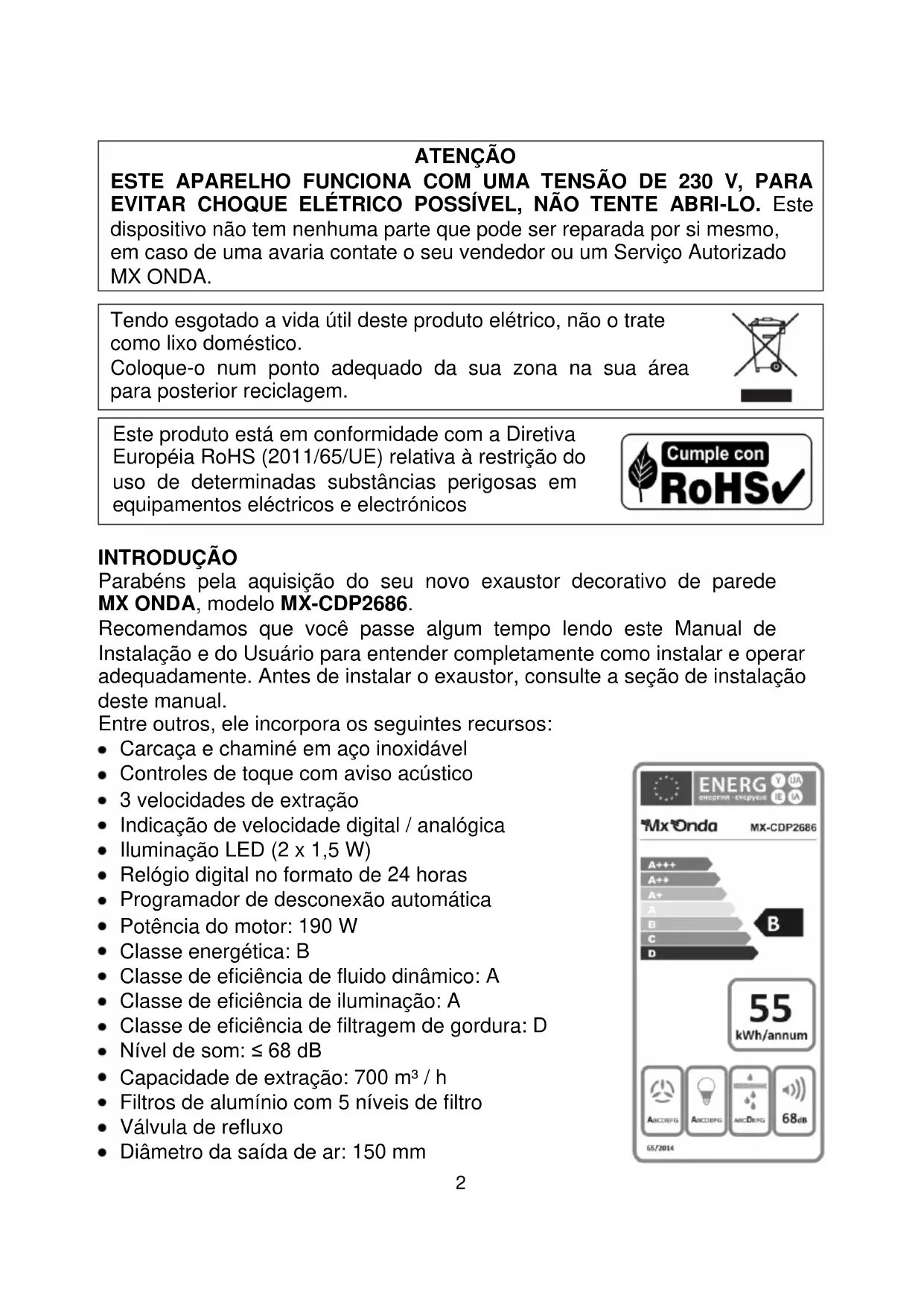 ATENÇÃO ESTE APARELHO FUNCIONA COM UMA TENSÃO DE 230 V, PARA EVITAR CHOQUE ELÉTRICO POSSÍVEL, NÃO TENTE ABRI-LO. Este dispositivo não tem nenhuma parte que pode ser reparada por si mesmo, em caso de uma avaria contate o seu vendedor ou um Serviço Autorizado MX ONDA. Tendo esgotado a vida útil deste produto elétrico, não o trate como lixo doméstico. Coloque-o num ponto adequado da sua zona na sua área para posterior reciclagem. Este produto está em conformidade com a Diretiva Européia RoHS (2011/65/UE) relativa à restrição do uso de determinadas substâncias perigosas em equipamentos eléctricos e electrónicos INTRODUÇÃO Parabéns pela aquisição do seu novo exaustor decorativo de parede MX ONDA, modelo MX-CDP2686. Recomendamos que você passe algum tempo lendo este Manual de Instalação e do Usuário para entender completamente como instalar e operar adequadamente. Antes de instalar o exaustor, consulte a seção de instalação deste manual. Entre outros, ele incorpora os seguintes recursos: Carcaça e chaminé em aço inoxidável Controles de toque com aviso acústico 3 velocidades de extração Indicação de velocidade digital / analógica Iluminação LED (2 x 1,5 W) Relógio digital no formato de 24 horas Programador de desconexão automática Potência do motor: 190 W Classe energética: B Classe de eficiência de fluido dinâmico: A Classe de eficiência de iluminação: A Classe de eficiência de filtragem de gordura: D Nível de som: ≤ 68 dB Capacidade de extração: 700 m³ / h Filtros de alumínio com 5 níveis de filtro Válvula de refluxo Diâmetro da saída de ar: 150 mm3