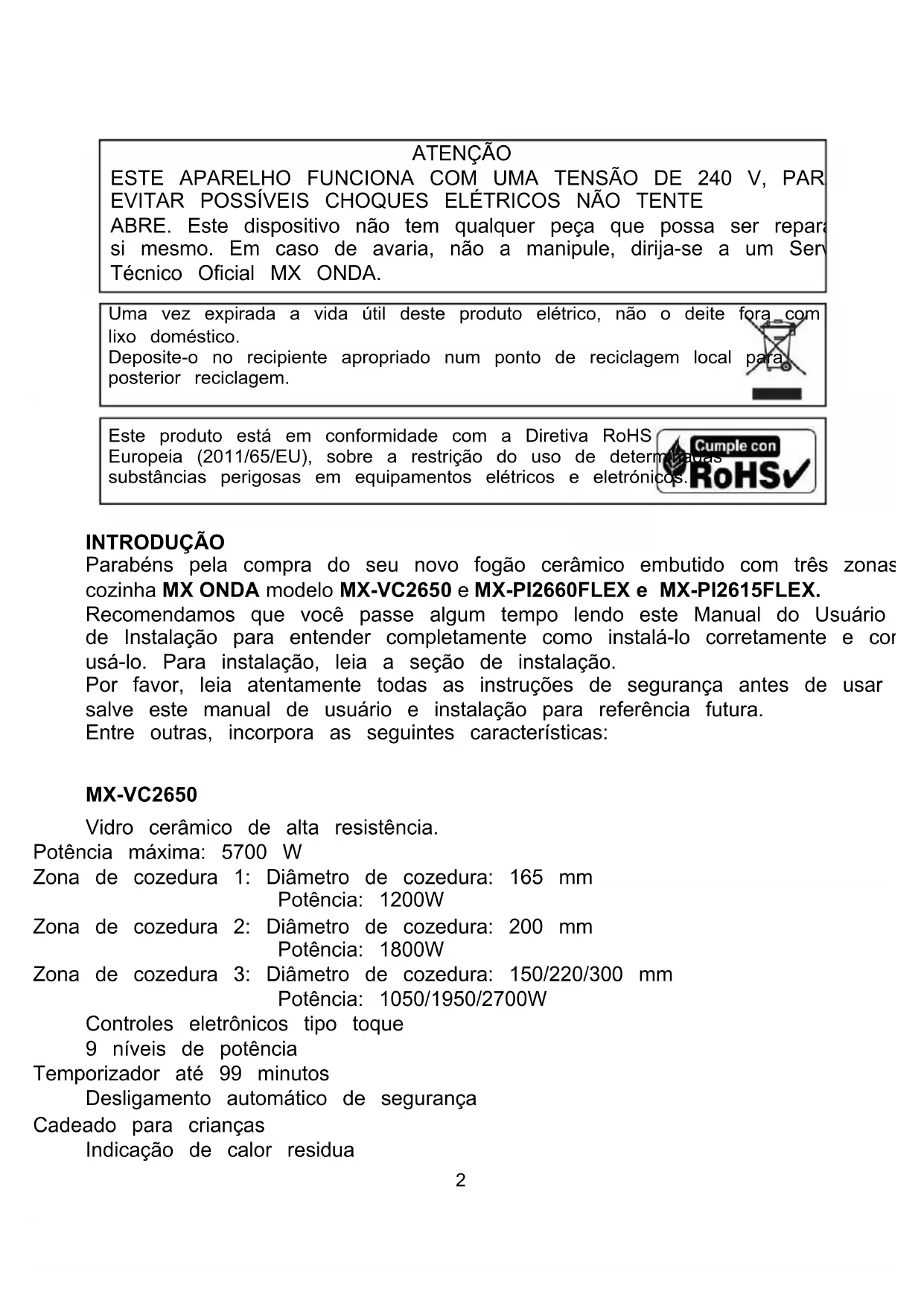 MODELO: MX-VC2650 MX-PI2660FLEX MX-PI2615FLEX ANTES DE USAR, LEIA ATENTAMENTE ESTE MANUAL2 ATENÇÃO ESTE APARELHO FUNCIONA COM UMA TENSÃO DE 240 V, PARA EVITAR POSSÍVEIS CHOQUES ELÉTRICOS NÃO TENTE ABRE. Este dispositivo não tem qualquer peça que possa ser reparada por si mesmo. Em caso de avaria, não a manipule, dirija-se a um Serviço Técnico Oficial MX ONDA. Uma vez expirada a vida útil deste produto elétrico, não o deite fora com o lixo doméstico. Deposite-o no recipiente apropriado num ponto de reciclagem local para posterior reciclagem. Este produto está em conformidade com a Diretiva RoHS Europeia (2011/65/EU), sobre a restrição do uso de determinadas substâncias perigosas em equipamentos elétricos e eletrónicos. INTRODUÇÃO Parabéns pela compra do seu novo fogão cerâmico embutido com três zonas de cozinha MX ONDA modelo MX-VC2650 e MX-PI2660FLEX e MX-PI2615FLEX. Recomendamos que você passe algum tempo lendo este Manual do Usuário e de Instalação para entender completamente como instalá-lo corretamente e como usá-lo. Para instalação, leia a seção de instalação. Por favor, leia atentamente todas as instruções de segurança antes de usar e salve este manual de usuário e instalação para referência futura. Entre outras, incorpora as seguintes características: MX-VC2650 Vidro cerâmico de alta resistência. Potência máxima: 5700 W Zona de cozedura 1: Diâmetro de cozedura: 165 mm Potência: 1200W Zona de cozedura 2: Diâmetro de cozedura: 200 mm Potência: 1800W Zona de cozedura 3: Diâmetro de cozedura: 150/220/300 mm Potência: 1050/1950/2700W