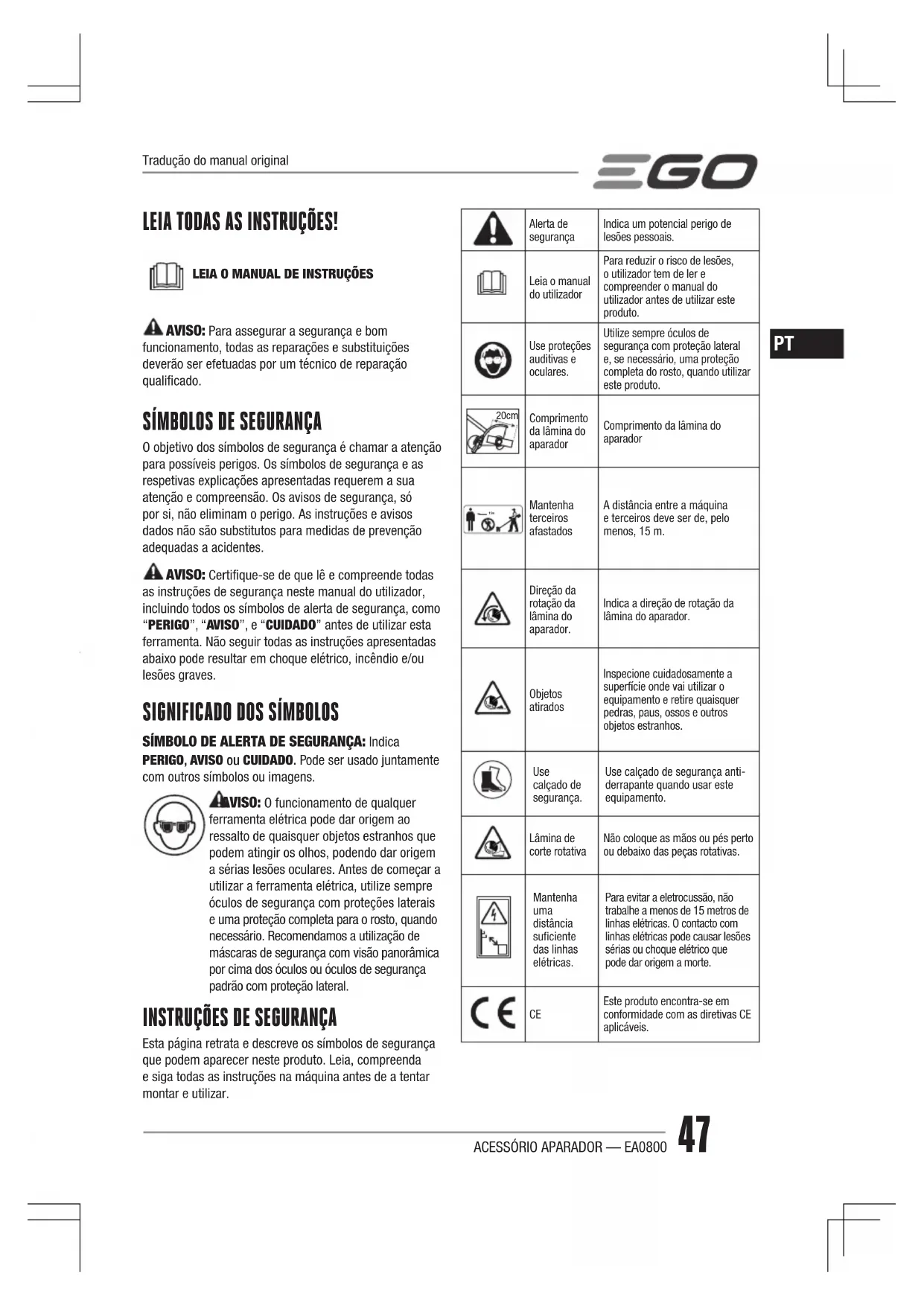 Esta página retrata e descreve os símbolos de segurança que podem aparecer neste produto. Leia, compreenda e siga todas as instruções na máquina antes de a tentar montar e utilizar. Alerta de segurançaIndica um potencial perigo de lesões pessoais.Leia o manual do utilizadorPara reduzir o risco de lesões, o utilizador tem de ler e compreender o manual do utilizador antes de utilizar este produto.Use proteções auditivas e oculares.Utilize sempre óculos de segurança com proteção lateral e, se necessário, uma proteção completa do rosto, quando utilizar este produto. 20cm Comprimento da lâmina do aparadorComprimento da lâmina do aparador 15m Mantenha terceiros afastadosA distância entre a máquina e terceiros deve ser de, pelo menos, 15 m.Direção da rotação da lâmina do aparador.Indica a direção de rotação da lâmina do aparador.Objetos atiradosInspecione cuidadosamente a superfície onde vai utilizar o equipamento e retire quaisquer pedras, paus, ossos e outros objetos estranhos. Use calçado de segurança.Use calçado de segurança anti-derrapante quando usar este equipamento.Lâmina de corte rotativaNão coloque as mãos ou pés perto ou debaixo das peças rotativas.Mantenha uma distância suciente das linhas elétricas.Para evitar a eletrocussão, não trabalhe a menos de 15 metros de linhas elétricas. O contacto com linhas elétricas pode causar lesões sérias ou choque elétrico que pode dar origem a morte. Este produto encontra-se em conformidade com as diretivas CE aplicáveis. Tradução do manual originalACESSÓRIO APARADOR — EA0800 48