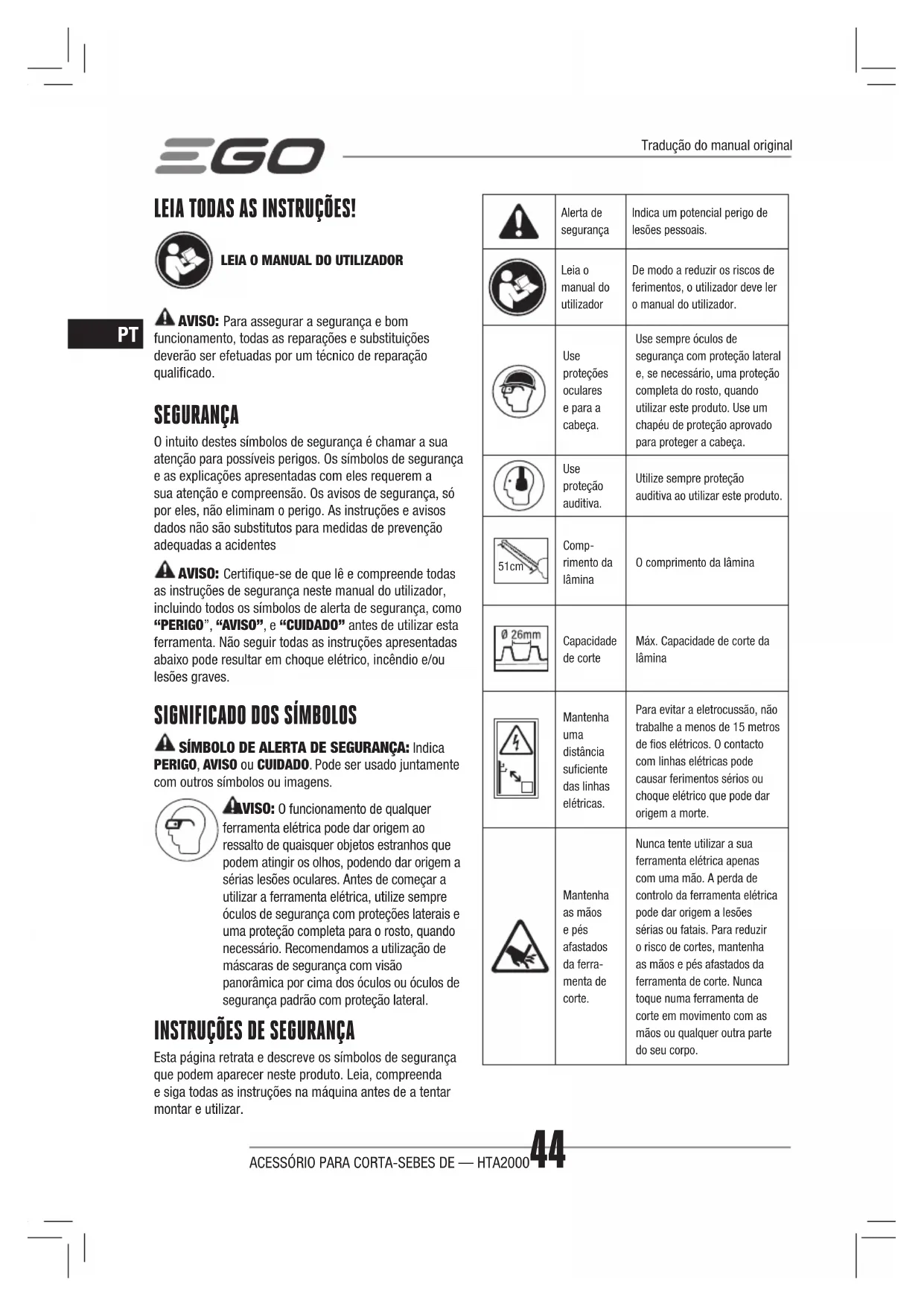Esta página retrata e descreve os símbolos de segurança que podem aparecer neste produto. Leia, compreenda e siga todas as instruções na máquina antes de a tentar montar e utilizar.Alerta de segurançaIndica um potencial perigo de lesões pessoais.Leia o manual do utilizadorDe modo a reduzir os riscos de ferimentos, outilizador deve ler o manual do utilizador. Use proteções oculares e para a cabeça.Use sempre óculos de segurança com proteção lateral e, se necessário, uma proteção completa do rosto, quando utilizar este produto. Use um chapéu de proteção aprovado para proteger a cabeça. Use proteção auditiva.Utilize sempre proteção auditiva ao utilizar este produto. 51cm Comp-rimento da lâminaO comprimento da lâminaCapacidade de corteMáx. Capacidade de corte da lâminaMantenha uma distância suficiente das linhas elétricas.Para evitar a eletrocussão, não trabalhe a menos de 15 metros de fios elétricos. O contacto com linhas elétricas pode causar ferimentos sérios ou choque elétrico que pode dar origem a morte.Mantenha as mãos e pés afastados da ferra-menta de corte.Nunca tente utilizar a sua ferramenta elétrica apenas com uma mão. A perda de controlo da ferramenta elétrica pode dar origem a lesões sérias ou fatais. Para reduzir o risco de cortes, mantenha as mãos e pés afastados da ferramenta de corte. Nunca toque numa ferramenta de corte em movimento com as mãos ou qualquer outra parte do seu corpo.Tradução do manual originalACESSÓRIO PARA CORTA-SEBES DE — HTA2000 45