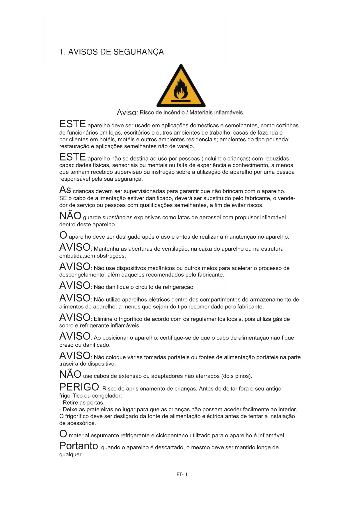 ● Não puxar o cabo elétrico ao puxar a cha do frigoríco. Por favor, agarre a cha rmemente e puxe-a diretamente da tomada. ● Para garantir uma utilização segura, não danique o cabo de alimentação nem utilize o mesmo quando este estiver danicado ou gasto. ● Utilize uma tomada especíca e esta não deve ser partilhada com outros aparelhos elétricos. A cha de alimentação deve ser conectada com rmeza com a tomada, caso contrário, poderá ocorrer incêndio. ● Por favor, assegure-se de que o elétrodo de ligação à terra da tomada está equipado com um o terra ável. ● Por favor, feche a válvula de fuga de gás e depois abra as portas e janelas no caso de fuga de gás e outros gases inamáveis. Não desligue o frigoríco e outros aparelhos elétricos considerando que a faísca pode causar um incêndio. ● Não utilize aparelhos elétricos na parte superior do aparelho, exceto se forem recomendados pelo fabricante. PT-31.4 Avisos para utilização ● Não desmonte ou reconstrua arbitrariamente o frigoríco, nem danique o circuito de refrigeração; a manutenção do aparelho deve ser conduzida por um especialista. ● O cabo de alimentação danicado tem de ser substituído pelo fabricante, pelo seu departamento de manutenção ou por prossionais relacionados para evitar perigo. ● Os espaços entre as portas dos frigorícos e entre as portas e o corpo do frigoríco são pequenos, note-se que não deve colocar a mão nestas áreas para evitar que se aperte o dedo. Por favor, seja gentil ao fechar a porta do frigoríco para evitar a queda de artigos. ● Não pegue em alimentos ou recipientes com as mãos molhadas na câmara de congelação quando o frigoríco estiver a funcionar, especialmente recipientes de metal, a m de evitar queimaduras por congelação. ● Não permita que as crianças subam ou entrem para o aparelho, caso contrário poderão sofrer lesões tais como sufocamento ou queda. ● Não coloque objetos pesados no topo do frigoríco considerando que os objetos podem cair quando se fecha ou abre a porta, e que podem ser causados ferimentos acidentais. ● Por favor, retire a cha da tomada no caso de falha de energia ou quando efetuar limpeza. Não ligue o frigoríco à rede elétrica dentro de cinco minutos para evitar danos no compressor devido a arranques sucessivos.