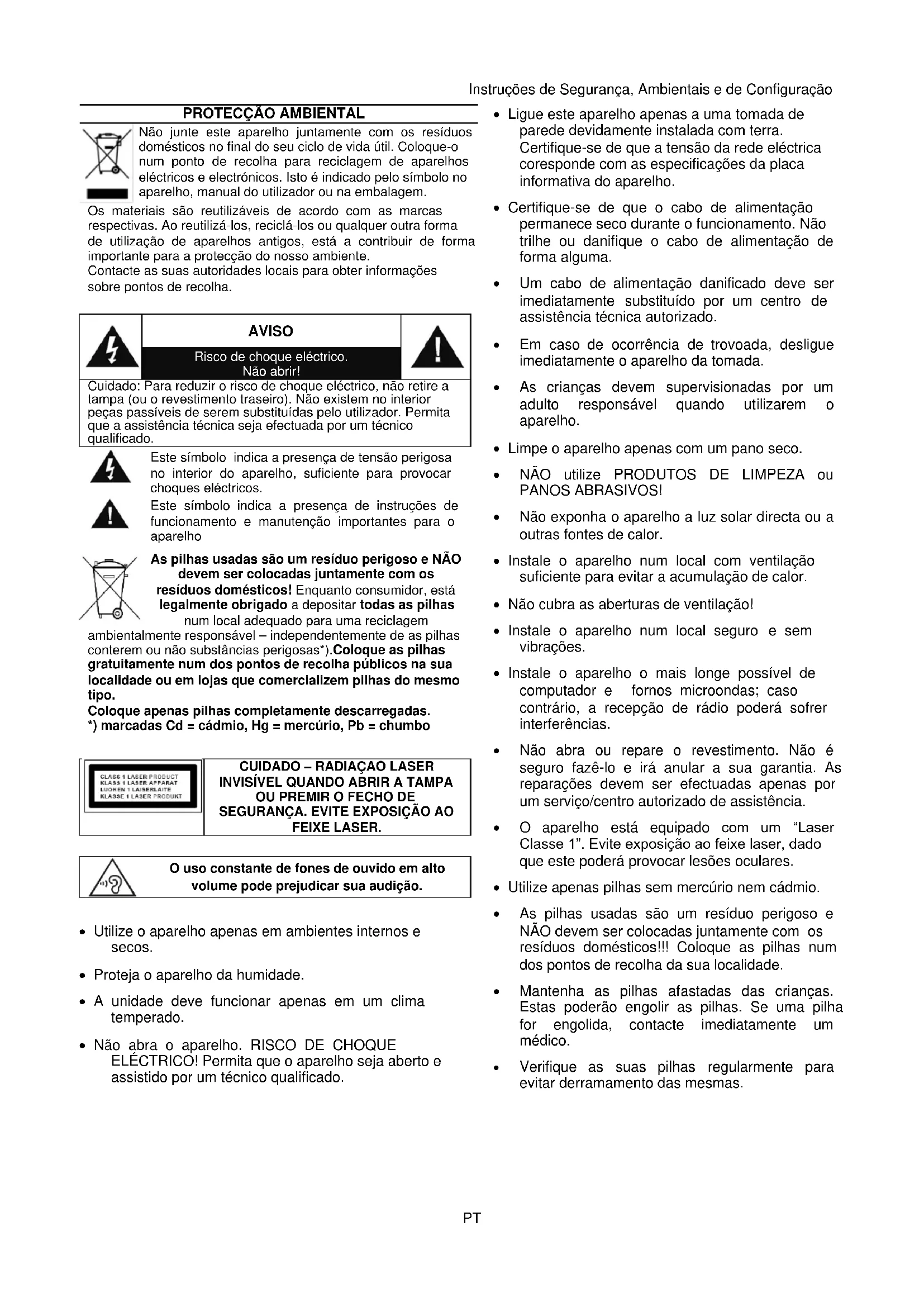 Utilize o aparelho apenas em ambientes internos e secos. Proteja o aparelho da humidade. A unidade deve funcionar apenas em um clima temperado. Não abra o aparelho. RISCO DE CHOQUE ELÉCTRICO! Permita que o aparelho seja aberto e assistido por um técnico qualificado. Ligue este aparelho apenas a uma tomada de parede devidamente instalada com terra. Certifique-se de que a tensão da rede eléctrica coresponde com as especificações da placa informativa do aparelho. Certifique-se de que o cabo de alimentação permanece seco durante o funcionamento. Não trilhe ou danifique o cabo de alimentação de forma alguma. Um cabo de alimentação danificado deve ser imediatamente substituído por um centro de assistência técnica autorizado. Em caso de ocorrência de trovoada, desligue imediatamente o aparelho da tomada. As crianças devem supervisionadas por um adulto responsável quando utilizarem o aparelho. Limpe o aparelho apenas com um pano seco. NÃO utilize PRODUTOS DE LIMPEZA ou PANOS ABRASIVOS! Não exponha o aparelho a luz solar directa ou a outras fontes de calor. Instale o aparelho num local com ventilação suficiente para evitar a acumulação de calor. Não cubra as aberturas de ventilação! Instale o aparelho num local seguro e sem vibrações. Instale o aparelho o mais longe possível de computador e fornos microondas; caso contrário, a recepção de rádio poderá sofrer interferências. Não abra ou repare o revestimento. Não é seguro fazê-lo e irá anular a sua garantia. As reparações devem ser efectuadas apenas por um serviço/centro autorizado de assistência. O aparelho está equipado com um “Laser Classe 1”. Evite exposição ao feixe laser, dado que este poderá provocar lesões oculares. Utilize apenas pilhas sem mercúrio nem cádmio. As pilhas usadas são um resíduo perigoso e NÃO devem ser colocadas juntamente com os resíduos domésticos!!! Coloque as pilhas num dos pontos de recolha da sua localidade. Mantenha as pilhas afastadas das crianças. Estas poderão engolir as pilhas. Se uma pilha for engolida, contacte imediatamente um médico. Verifique as suas pilhas regularmente para evitar derramamento das mesmas.CD9250