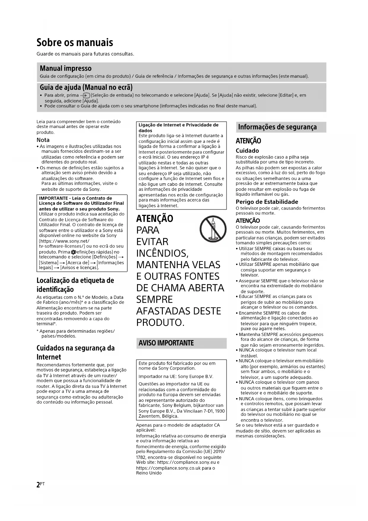 SEMPRE AFASTADAS DESTE PRODUTO. Apenas para o modelo de adaptador CA aplicável:Informação relativa ao consumo de energia e outra informação relativa ao fornecimento de energia, conforme exigido pelo Regulamento da Comissão (UE) 2019/1782, encontra-se disponível no seguinte Web site: https://compliance.sony.eu e https://compliance.sony.co.uk para o Reino Unido ATENÇÃO Cuidado Risco de explosão caso a pilha seja substituída por uma de tipo incorreto.As pilhas não podem ser expostas a calor excessivo, como à luz do sol, perto do fogo ou situações semelhantes ou a uma pressão de ar extremamente baixa que pode resultar em explosão ou fuga de líquido inflamável ou gás. Perigo de Estabilidade O televisor pode cair, causando ferimentos pessoais ou morte. ATENÇÃO O televisor pode cair, causando ferimentos pessoais ou morte. Muitos ferimentos, em particular nas crianças, podem ser evitados tomando simples precauções como:• Utilizar SEMPRE caixas ou bases ou métodos de montagem recomendados pelo fabricante do televisor.• Utilizar SEMPRE apenas mobiliário que consiga suportar em segurança o televisor.• Assegurar SEMPRE que o televisor não se encontra na extremidade do mobiliário de suporte.• Educar SEMPRE as crianças para os perigos de subir ao mobiliário para alcançar o televisor ou os comandos.• Encaminhe SEMPRE os cabos de alimentação e ligação conectados ao televisor para que ninguém tropece, puxe ou agarre neles.• Mantenha SEMPRE acessórios pequenos fora do alcance de crianças, de forma que não sejam erroneamente ingeridos.• NUNCA coloque o televisor num local instável.• NUNCA coloque o televisor em mobiliário alto (por exemplo, armários ou estantes) sem fixar ambos, o mobiliário e o televisor, a um suporte adequado.• NUNCA coloque o televisor com panos ou outros materiais que fiquem entre o televisor e o mobiliário de suporte.• NUNCA coloque itens, como brinquedos e controlos remotos, que possam levar as crianças a tentar subir à parte superior do televisor ou mobiliário no qual se encontra o televisor.Se o seu televisor está a ser guardado e mudado de sítio, devem ser aplicadas as mesmas considerações. Sobre os manuais Guarde os manuais para futuras consultas. Manual impresso Guia de configuração (em cima do produto) / Guia de referência / Informações de segurança e outras informações (este manual). Guia de ajuda (Manual no ecrã)