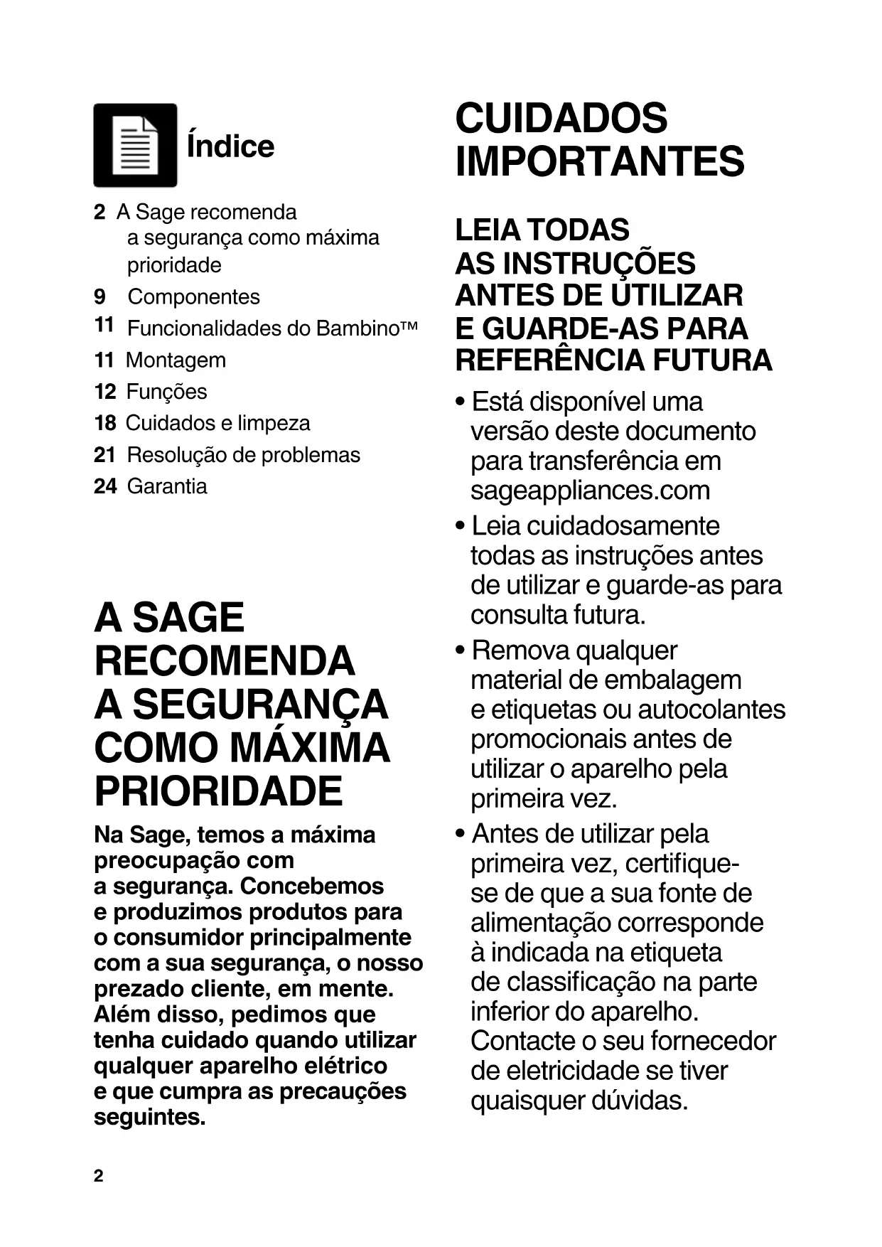 - Antes de utilizar pela primeira vez, certique- se de que a sua fonte de alimentação corresponde à indicada na etiqueta de classicação na parte inferior do aparelho. Contacte o seu fornecedor de eletricidade se tiver quaisquer dúvidas. Índice 2 A Sage recomenda a segurança como máxima prioridade9 Componentes11 Funcionalidades do Bambino 11 Montagem12 Funções18 Cuidados e limpeza21 Resolução de problemas24 Garantia3