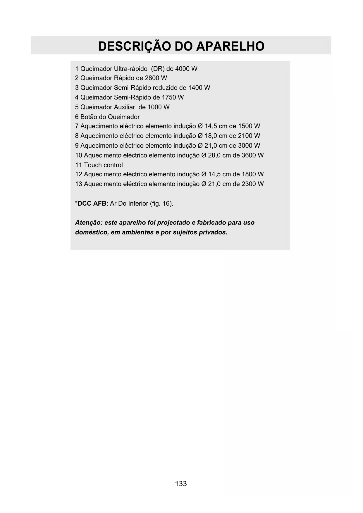1 Queimador Ultra-rápido (DR) de 4000 W 2 Queimador Rápido de 2800 W 3 Queimador Semi-Rápido reduzido de 1400 W 4 Queimador Semi-Rápido de 1750 W 5 Queimador Auxiliar de 1000 W 6 Botão do Queimador 7 Aquecimento eléctrico elemento indução Ø 14,5 cm de 1500 W 8 Aquecimento eléctrico elemento indução Ø 18,0 cm de 2100 W 9 Aquecimento eléctrico elemento indução Ø 21,0 cm de 3000 W 10 Aquecimento eléctrico elemento indução Ø 28,0 cm de 3600 W 11 Touch control 12 Aquecimento eléctrico elemento indução Ø 14,5 cm de 1800 W 13 Aquecimento eléctrico elemento indução Ø 21,0 cm de 2300 W *DCC AFB: Ar Do Inferior (fig. 16). Atenção: este aparelho foi projectado e fabricado para uso doméstico, em ambientes e por sujeitos privados.134