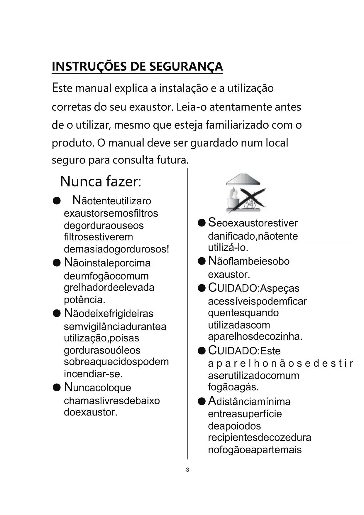 ste manual explica a instalação e a utilização corretas do seu exaustor. Leia-o atentamente antes de o utilizar, mesmo que esteja familiarizado com o produto. O manual deve ser guardado num local seguro para consulta futura. Nunca fazer: ● Não tente utilizar o exaustor sem os filtros de gordura ou se os filtros estiverem demasiado gordurosos!