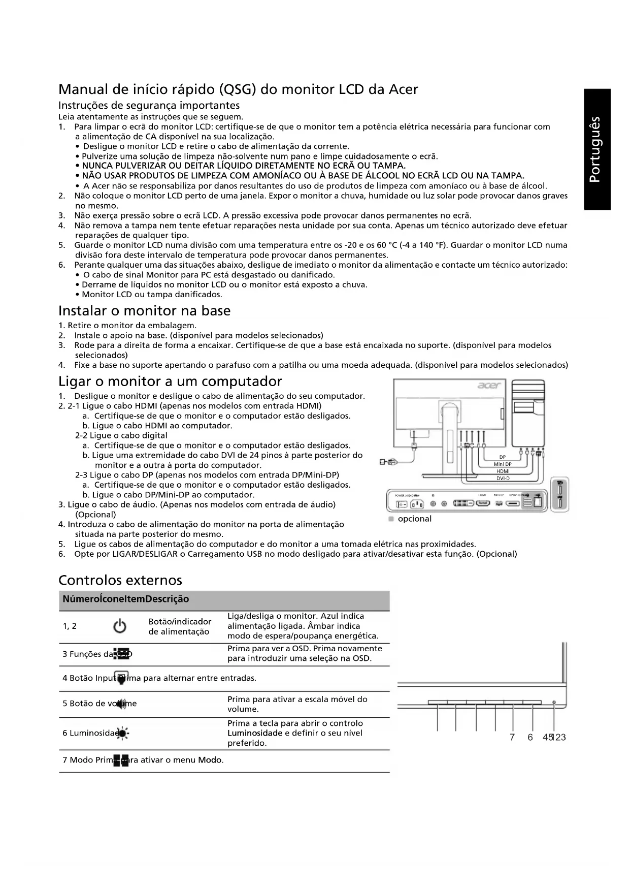 3654Português brasileiro Guia de início rápido do monitor LCD Acer (QSG) Instruções de segurança importantes Leia as instruções a seguir atentamente. 1. Para limpar a tela do monitor LCD: Verifique se a classificação do monitor permite que ele seja conectado à fonte de alimentação CA disponível na sua localidade.