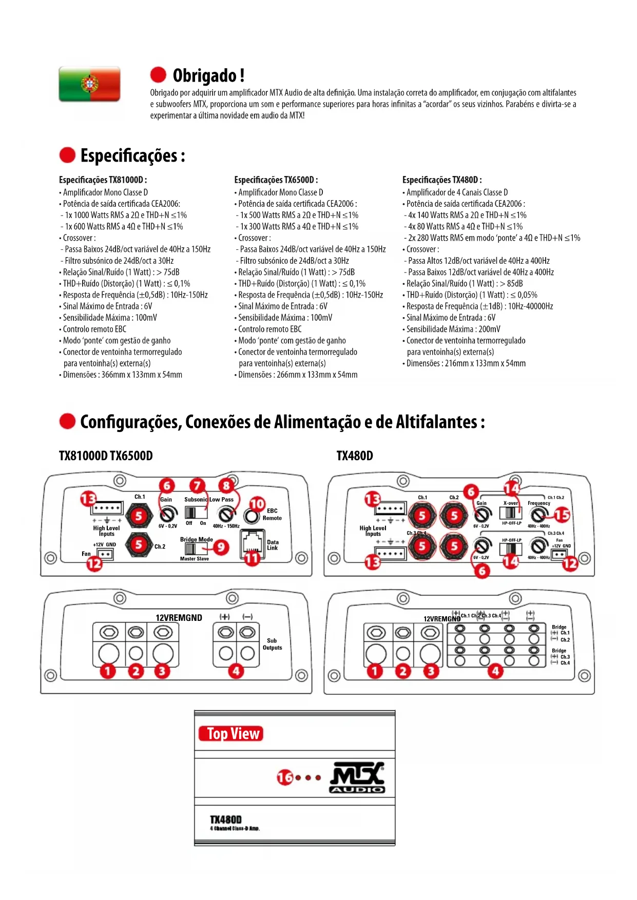 Off Bridge Mode Master Slave EBC Remote Data Link Subsonic Low Pass 40Hz - 150Hz High Level Inputs Ch.2 Ch.1 12VREMGND X-overHP-OFF-LPHP-OFF-LP Gain 6V - 0,2V6V - 0,2V40Hz - 400HzFrequency40Hz - 400HzCh.1 Ch.2Ch.3 Ch.4 Ch.1 Bridge Ch.2 Ch.3 Bridge Ch.4 Ch.1 Ch.2 Ch.3 Ch.4High LevelInputs Ch.1 Ch.3 Ch.4 Ch.2 Fan +12V GND TX81000D TX6500D TX480D Top ViewTerminal de Massa – É necessária uma boa ligação de massa para o funcionamento correto do seu amplificador. Deve ser usado um cabo curto do mesmo calibre do cabo de alimentação para ligar o terminal de massa diretamente ao chassis do veículo. Deve remover qualquer vestígio de tinta ou sujidade da superfície, expondo o metal limpo no local onde será feita a ligação de massa. Terminal Remoto – O amplificador pode ser ligado ao aplicar 12 volts neste terminal. De uma forma geral, esta voltagem é fornecida por um cabo do auto-rádio assinalado com “remote” ou “electric antenna”. Terminal de Alimentação +12V - Esta é a entrada principal de potência no amplificador e deve ser ligada diretamente ao terminal positivo da bateria da viatura para que o amplificador funcione devidamente. Use cautela ao instalar este cabo no veículo. Evite que passe ao lado de cabos RCA, de antena, ou de outro equipamento sensível, já que a elevada currente que flui por este cabo pode introduzir ruído no seu sistema de som. É também muito importante ter uma ligação de qualidade para máxima performance. Recomendamos o uso de um cabo de 50mm2. Terminais de altifalante TX81000D e TX6500D (terminais de subwoofer) : Ligue o(s) subwoofer(s) a estes terminais. Se estiver a utilizar dois subwoofers ou um subwoofer com bobine dupla, respeite a fase. Os dois conectores (+), assim como os (-) estão em paralelo no amplificador. Terminais de Altifalante TX480D : Ligue os altifalantes a estes terminais. Observe a polaridade dos altifalantes ao longo do sistema. Um faseamento incorreto pode resultar na perda de resposta de baixos e/ou em fraca qualidade acústica em geral. Modo Ponte: Utilize apenas o terminal positivo do canal 1 e o terminal negativo do canal 2. Utilize apenas o terminal positivo do canal 3 e o terminal negativo do canal 4. Aviso : não ponteie o amplificador com uma impedância inferior a 4Ω. Entradas RCA (Canais 1, 2, 3, 4) – Estas entradas são utilizadas com auto-rádios que possuem saídas de RCA ou de nível de linha (os auto-rádios requerem um nível mínimo de saída de 200mV para o funcionamento correto do amplificador). A MTX recomenda que utilize apenas cabos RCA de alta qualidade para diminuir a possibilidade de entrada de ruído no sistema. Controlo de Ganho - Adapta a sensibilidade de entrada do amplificador à do auto-rádio. A faixa de operação varia entre 200mV e 6V. Ajustar o ganho