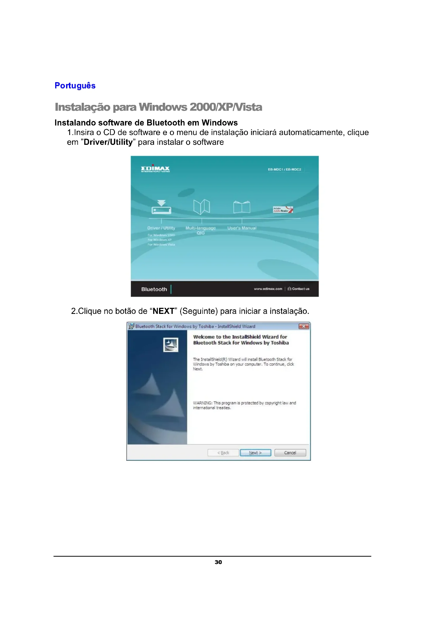 Instalação para Windows 2000/XP/Vista Instalando software de Bluetooth em Windows 1.Insira o CD de software e o menu de instalação iniciará automaticamente, clique em ”Driver/Utility” para instalar o software