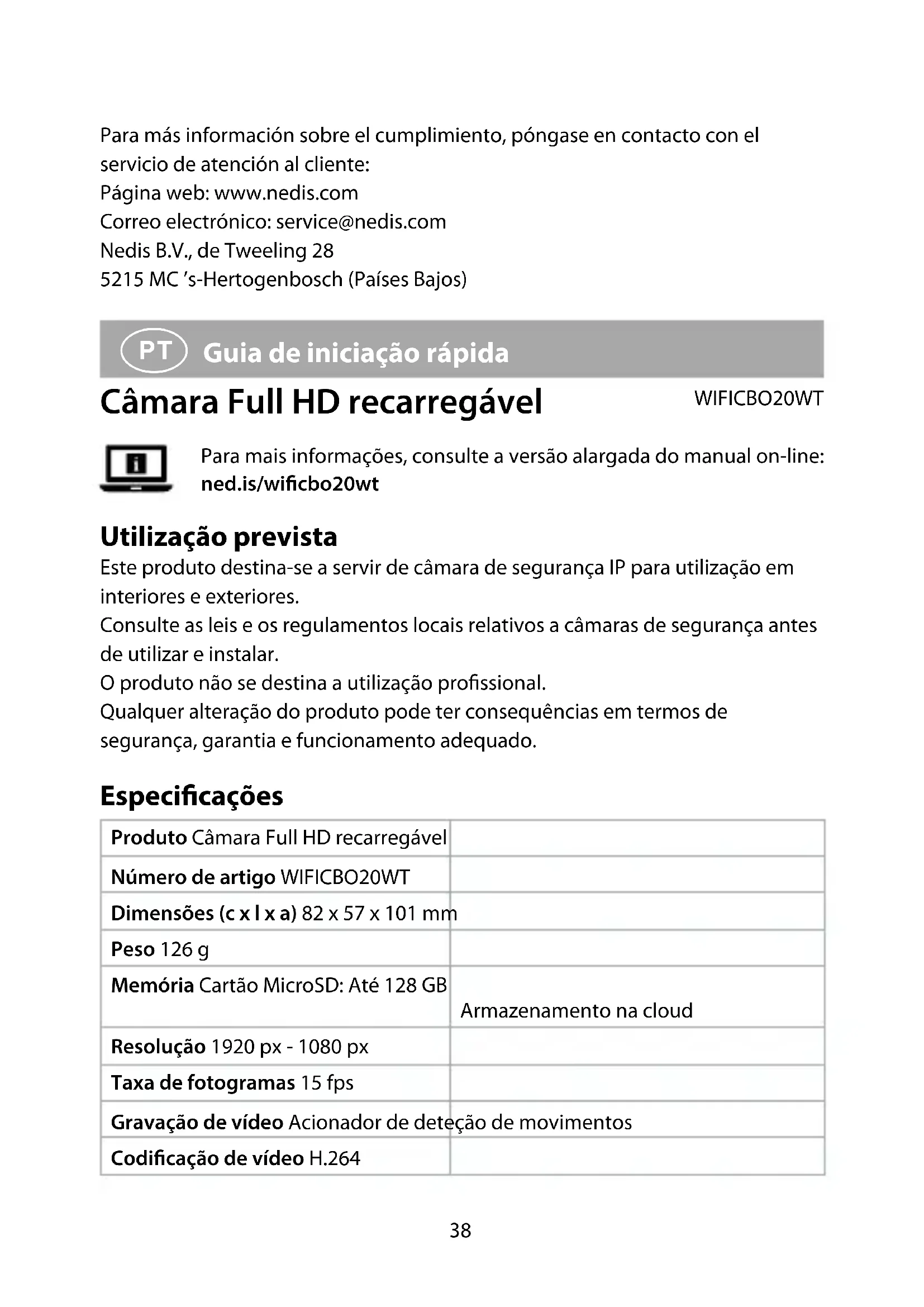 Guia de iniciação rápida Câmara Full HD recarregável WIFICBO20WT Para mais informações, consulte a versão alargada do manual on-line: ned.is/wicbo20wt Utilização prevista Este produto destina-se a servir de câmara de segurança IP para utilização em interiores e exteriores. Consulte as leis e os regulamentos locais relativos a câmaras de segurança antes de utilizar e instalar. O produto não se destina a utilização prossional. Qualquer alteração do produto pode ter consequências em termos de segurança, garantia e funcionamento adequado. Especicações Produto Câmara Full HD recarregável Número de artigo WIFICBO20WT Dimensões (c x l x a) 82 x 57 x 101 mm Peso 126 g Memória Cartão MicroSD: Até 128 GB Armazenamento na cloud Resolução 1920 px - 1080 px Taxa de fotogramas 15 fps Gravação de vídeo Acionador de deteção de movimentos Codicação de vídeo H.26439 Ângulo de visualização 120 ° À prova de água IP65 Potência de transmissão de rádio máx. 16 dBm Ganho de antena 2 dBi Ligações sem os Wi-Fi: 802.11 b/g/n 2,4 GHz Gama de frequências Wi-Fi 2412 - 2472 MHz Temperatura de armazenamento -20 - 60 °C Temperatura de funcionamento -20 - 55 °C Entrada de alimentação 5 VDC Alcance da visão noturna 6 - 8 m Sensor de imagem Sensor CMOS de 2 MP 1/2,9" CMOS Microfone integrado - 38 dB Altifalante integrado 8 Ω / 1 W Tipo de bateria 2 x 18650 (iões de lítio) Peças principais (imagem A) 1 Suporte de montagem 2 Interruptor de bloqueio 3 Lente da câmara 4 Microfone 5 Sensor de luz 6 LED indicador de estado 7 Sensor PIR 8 Porta micro USB 9 Altifalante q Entrada de cartão micro SD w Botão de reiniciação e Botão de ligar/ desligar r Compartimento das pilhas t Cabo Micro USB Instruções de segurança