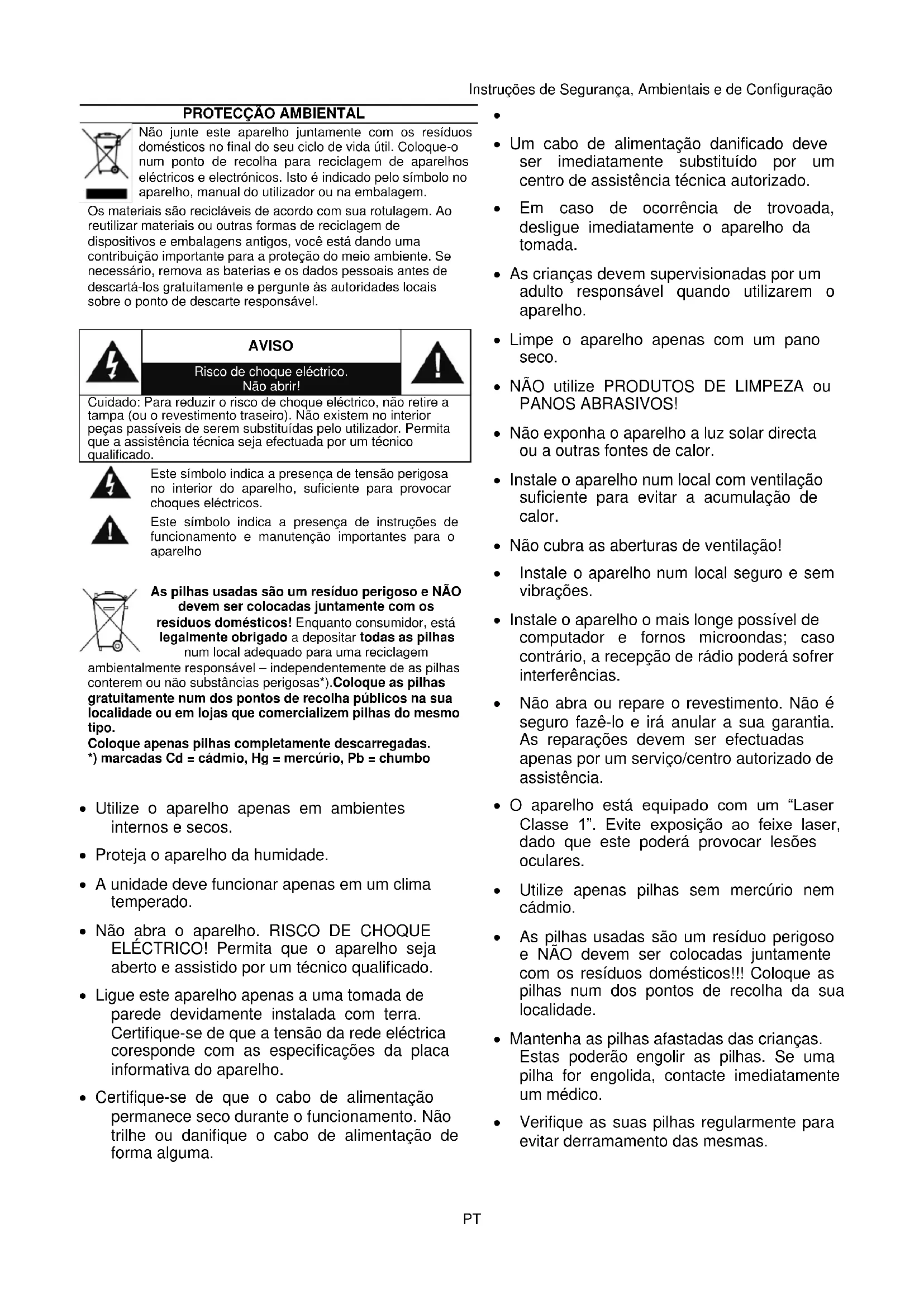 - O aparelho está equipado com um “Laser Classe 1”. Evite exposição ao feixe laser, dado que este poderá provocar lesões oculares.