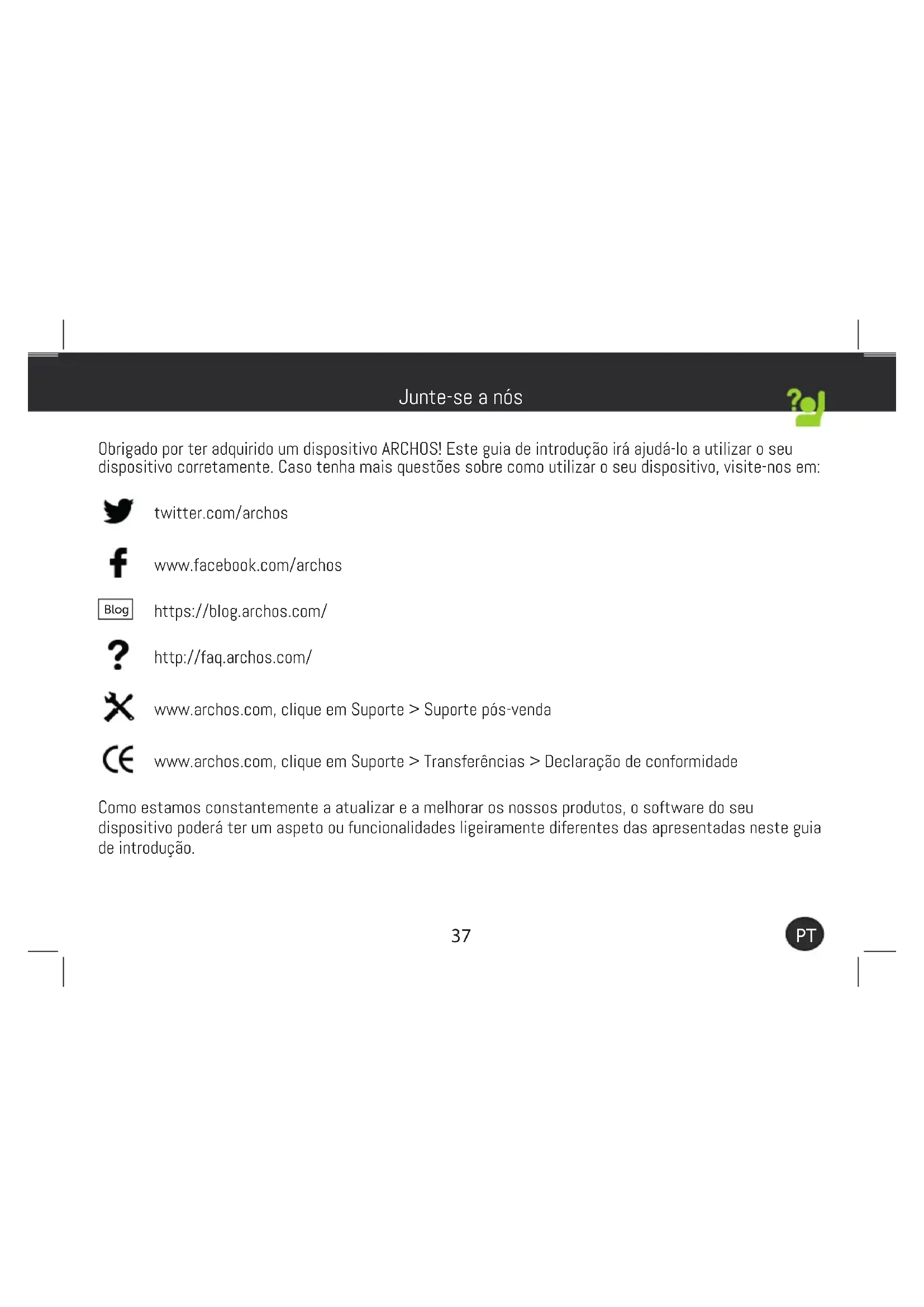 Obrigado por ter adquirido um dispositivo ARCHOS! Este guia de introdução irá ajudá-lo a utilizar o seu dispositivo corretamente. Caso tenha mais questões sobre como utilizar o seu dispositivo, visite-nos em: twitter.com/archos www.facebook.com/archos Blog https://blog.archos.com/ http://faq.archos.com/ www.archos.com, clique em Suporte > Suporte pós-venda www.archos.com, clique em Suporte > Transferências > Declaração de conformidade Como estamos constantemente a atualizar e a melhorar os nossos produtos, o software do seu dispositivo poderá ter um aspeto ou funcionalidades ligeiramente diferentes das apresentadas neste guia de introdução. Junte-se a nós38 Warranty INPUT: 5V 1.5AModel: AC101AS3GV2MADE IN PRCARCHOS SA. 12 rue Ampère 91430 Igny France Access 101