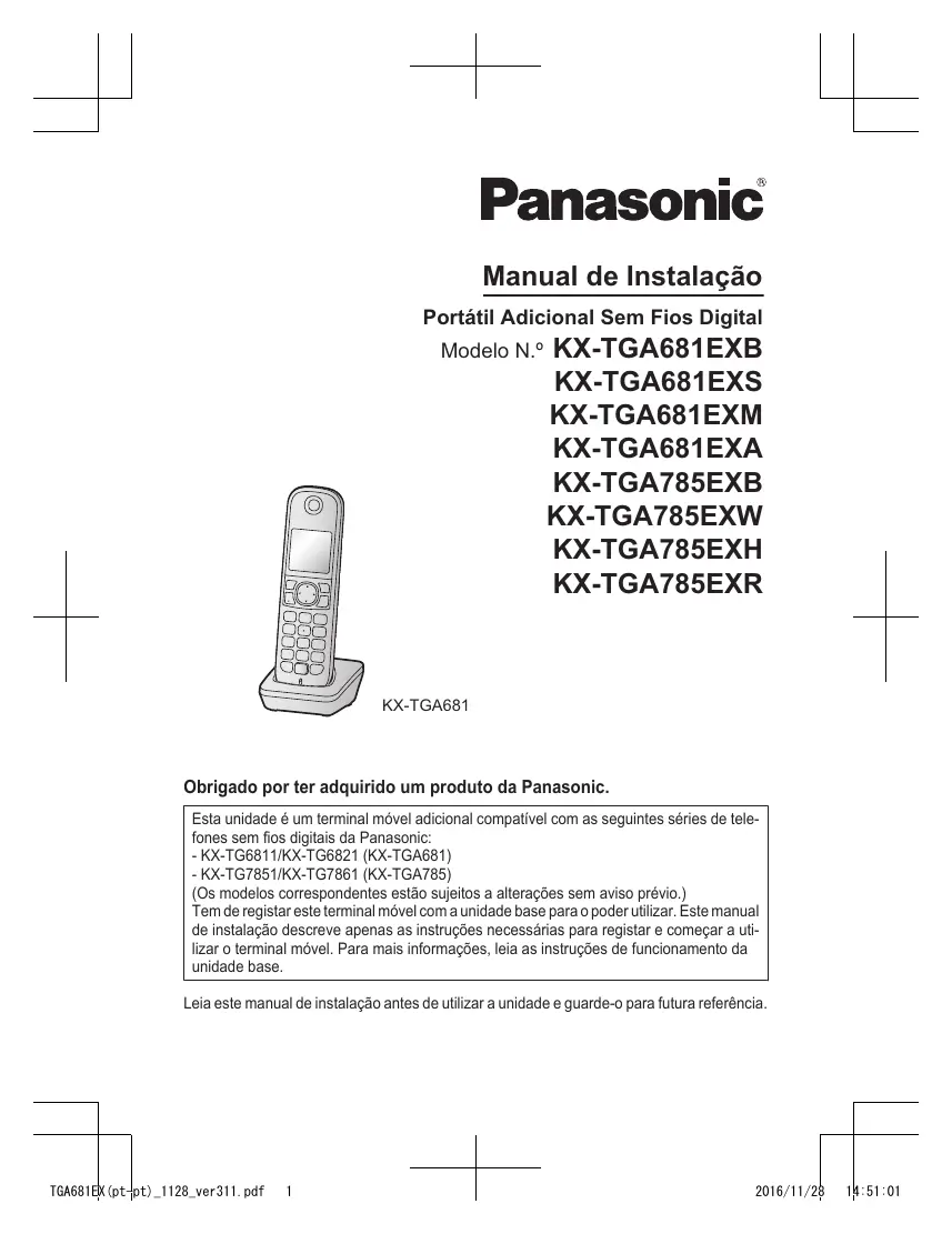 2016/11/28 14:47:23 Manual de Instalação Portátil Adicional Sem Fios Digital Modelo N.º KX-TGA681EXB KX-TGA681EXS KX-TGA681EXM KX-TGA681EXA KX-TGA785EXB KX-TGA785EXW KX-TGA785EXH KX-TGA785EXR KX-TGA681 Obrigado por ter adquirido um produto da Panasonic. Esta unidade é um terminal móvel adicional compatível com as seguintes séries de telefones sem fios digitais da Panasonic: - KX-TG6811/KX-TG6821 (KX-TGA681) - KX-TG7851/KX-TG7861 (KX-TGA785) (Os modelos correspondentes estão sujeitos a alterações sem aviso prévio.) Tem de registar este terminal móvel com a unidade base para o poder utilizar. Este manual de instalação descreve apenas as instruções necessárias para registar e começar a utilizar o terminal móvel. Para mais informações, leia as instruções de funcionamento da unidade base. Leia este manual de instalação antes de utilizar a unidade e guarde-o para futura referência. TGA681EX(pt-pt)_1128_ver311.pdf