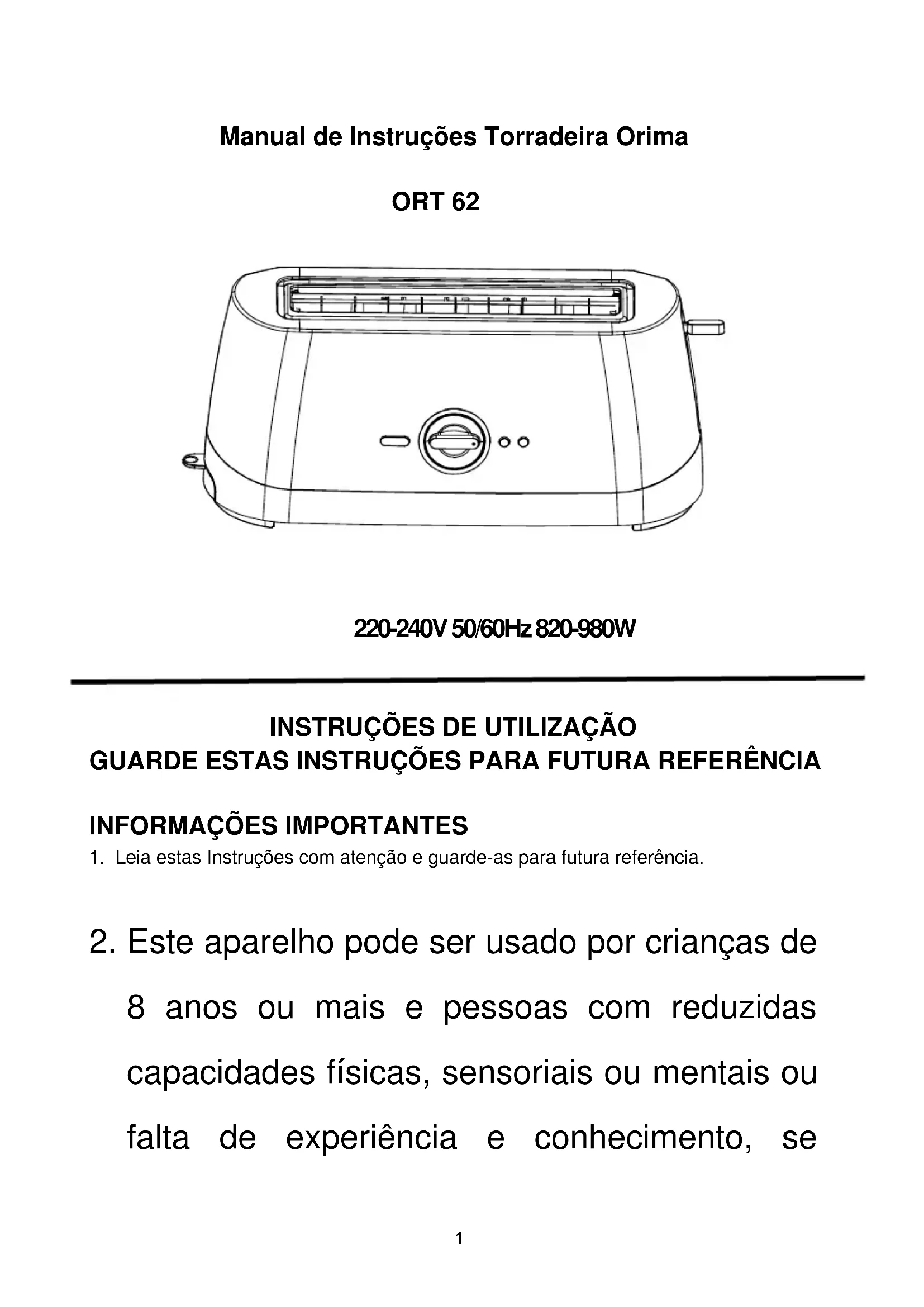 Manual de Instruções Torradeira Orima ORT 62