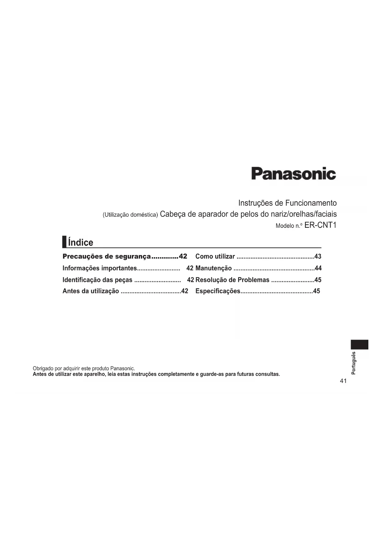 - Indre blad Fjern Træk for at fjerne det indre blad. Monter Indsæt det indre blad lige ind i det ydre blad. Fejlnding Problem Handling Skæreydeevnen er reduceret. Udskift bladet. Rengør det indre blad. Der er en underlig lugt. Bladet bevæger/roterer ikke ordentligt. Sugeevnen er dårlig. Rengør trimmerboksen. Luk for vandindtaget. Hvis problemerne stadig ikke kan løses, skal du kontakte din forhandler eller et servicecenter autoriseret af Panasonic for reparation. Specikationer Luftbåren akustisk støj 62 (dB (A) re 1 pW) Dette produkt er kun beregnet til privat brug.41 Português Instruções de Funcionamento (Utilização doméstica) Cabeça de aparador de pelos do nariz/orelhas/faciais Modelo n.º ER‑CNT1 Obrigado por adquirir este produto Panasonic. Antesdeutilizaresteaparelho,leiaestasinstruçõescompletamenteeguarde‑asparafuturasconsultas. Precauções de segurança p. 42