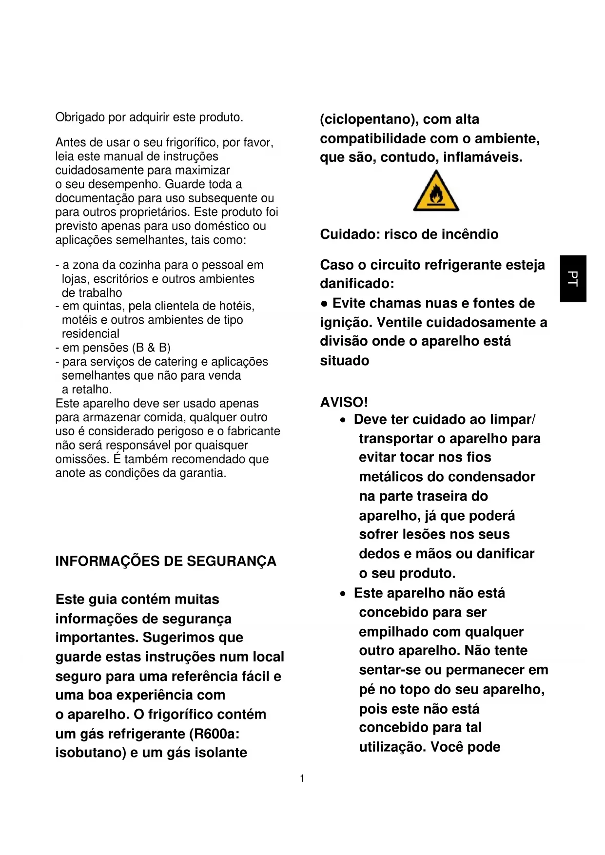 Este guia contém muitas informações de segurança importantes. Sugerimos que guarde estas instruções num local seguro para uma referência fácil e uma boa experiência com o aparelho. O frigorífico contém um gás refrigerante (R600a: isobutano) e um gás isolante (ciclopentano), com alta compatibilidade com o ambiente, que são, contudo, inflamáveis. Cuidado: risco de incêndio Caso o circuito refrigerante esteja danificado: ● Evite chamas nuas e fontes de ignição. Ventile cuidadosamente a divisão onde o aparelho está situado AVISO!