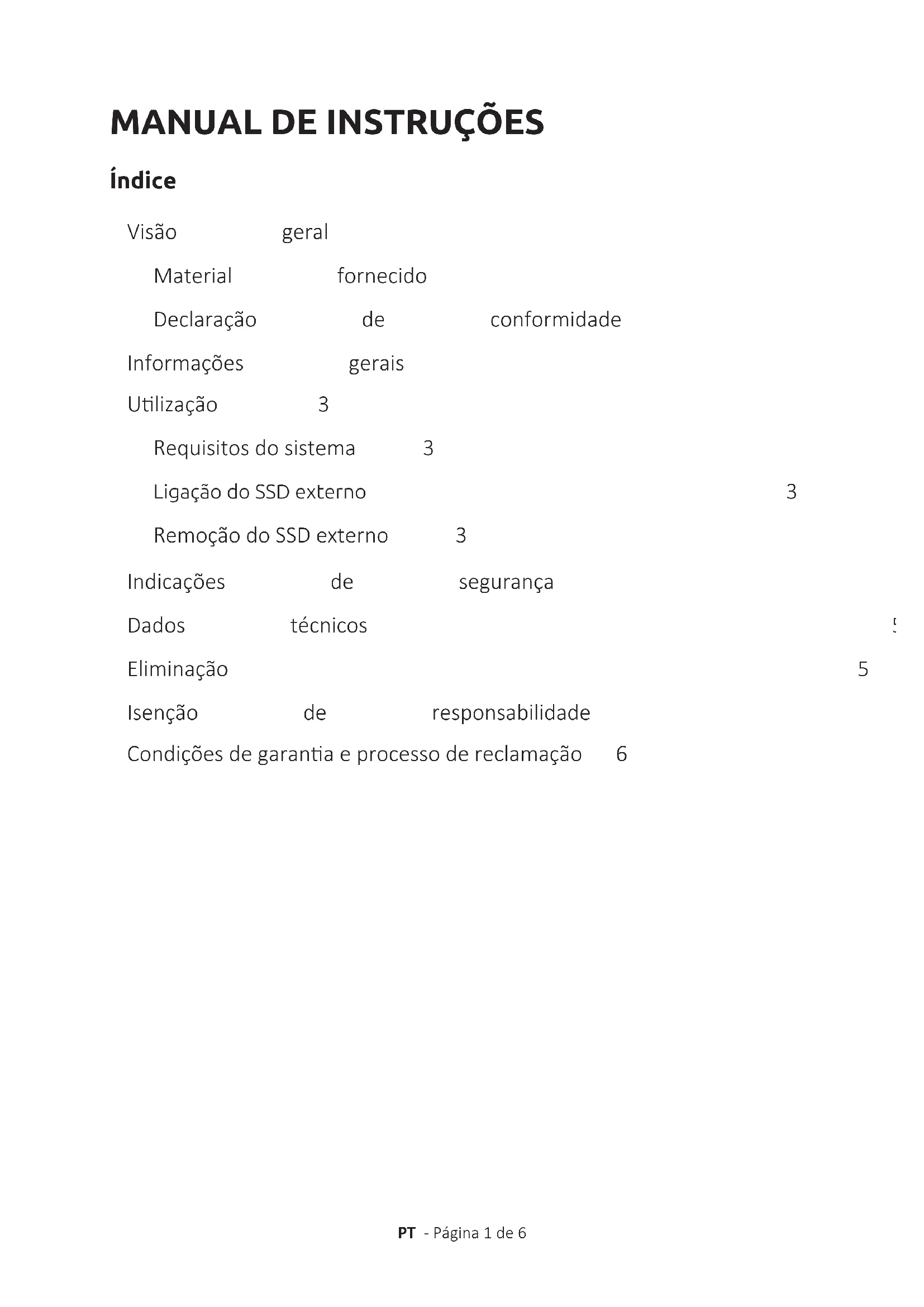 INTENSO INTERNATIONAL GMBH I Service Center (Su número RMA) Kopernikusstraße 12-14 I D-49377 VechtaMANUAL DE INSTRUÇÕES PT - Página 1 de 6 Índice Visão geral 2 Material fornecido 2 Declaração de conformidade 2 Informações gerais 2 Ulização 3 Requisitosdosistema 3 Ligação do SSD externo3 RemoçãodoSSDexterno 3 Indicações de segurança 4 Dados técnicos 5 Eliminação 5 Isenção de responsabilidade 5 Condiçõesdegaranaeprocessodereclamação 6PT - Página 2 de 6 Leiaestemanualcomatençãoesigatodasasindicaçõesnelemencionadas,paragaranruma longavidaúleumaulizaçãoáveldoaparelho.Mantenhaestemanualnumlocalacessívele passe-oaoutrosulizadoresdoaparelho. Sobre este manual