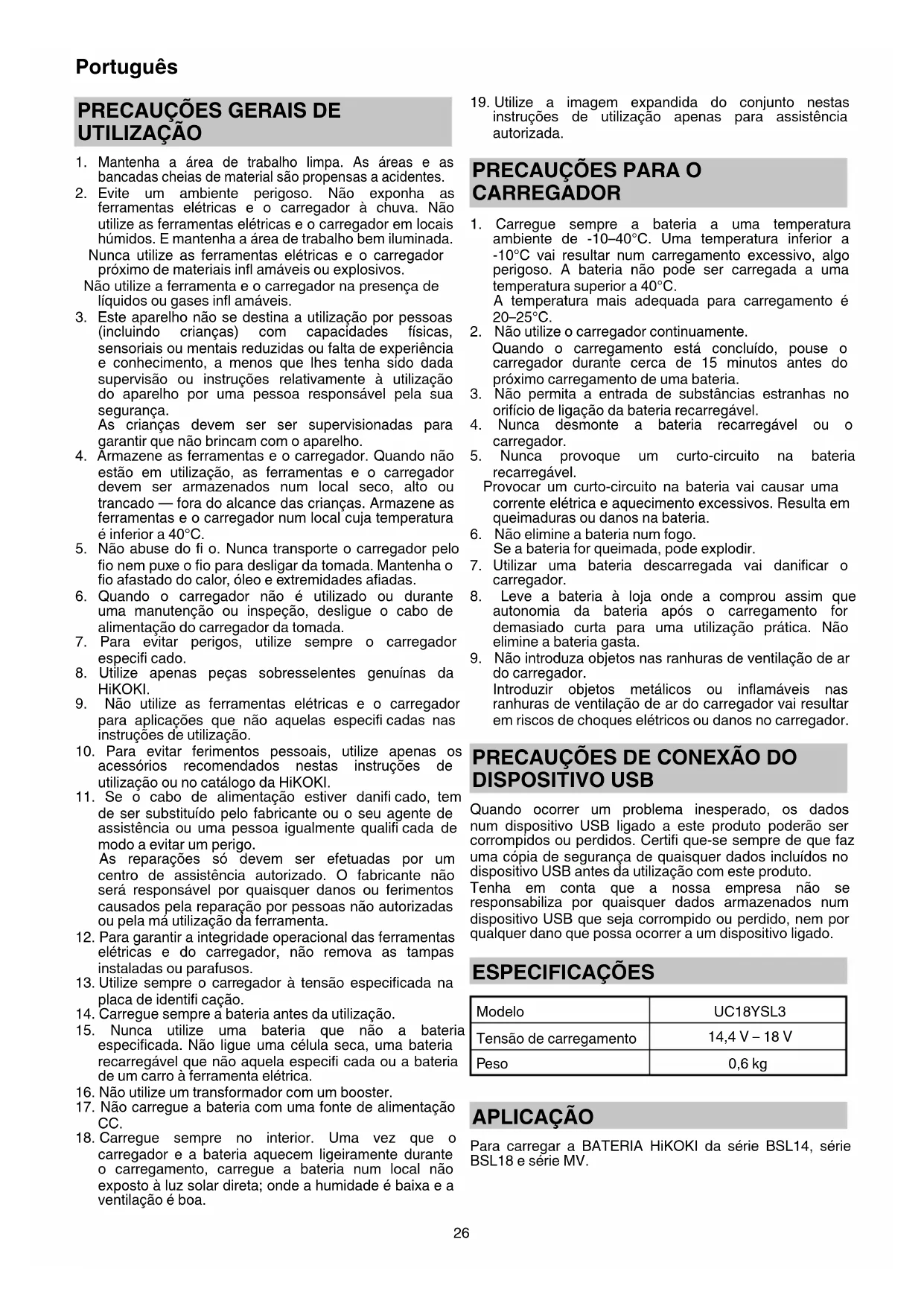 DISPOSITIVO USB Quando ocorrer um problema inesperado, os dados num dispositivo USB ligado a este produto poderão ser corrompidos ou perdidos. Certifi que-se sempre de que faz uma cópia de segurança de quaisquer dados incluídos no dispositivo USB antes da utilização com este produto. Tenha em conta que a nossa empresa não se responsabiliza por quaisquer dados armazenados num dispositivo USB que seja corrompido ou perdido, nem por qualquer dano que possa ocorrer a um dispositivo ligado. ESPECIFICAÇÕES Modelo UC18YSL3 Tensão de carregamento 14,4 V – 18 V Peso 0,6 kg APLICAÇÃO Para carregar a BATERIA HiKOKI da série BSL14, série BSL18 e série MV. 000BookUC18YSL3.indb26000BookUC18YSL3.indb26 2018/06/1910:43:282018/06/1910:43:2827 Português Tabela 1 Indicações da luz do indicador de carga Luz do indicador de carga (VERMELHO / AZUL / VERDE / ROXO) Antes do carregamento Pisca (VERMELHO) Acende-se durante 0,5 segundos. Não se acende durante 0,5 segundos. (desliga-se durante 0,5 segundos) Ligado à fonte de alimentação Durante o carregamento Pisca (AZUL) Acende-se durante 0,5 segundos. Não se acende durante 1 segundo. (desligado durante 1 segundo) Capacidade da bateria inferior a 50% Pisca