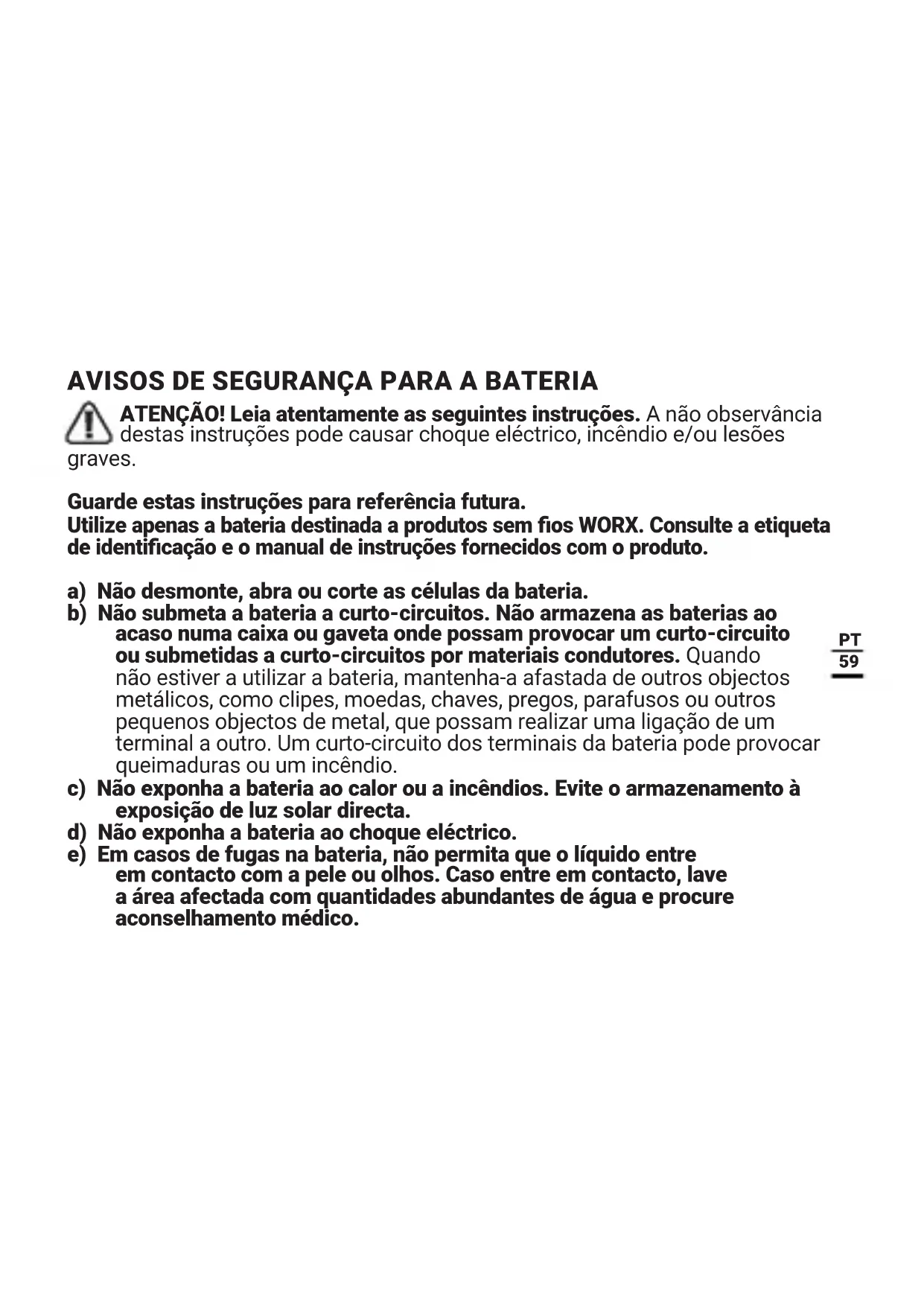 e) Em casos de fugas na bateria, não permita que o liquido entre em contacto com a pele ou olhos. Caso entre em contacto, lave a area afectada com quantidades abundantes de agua e procure aconselhoamento medico.