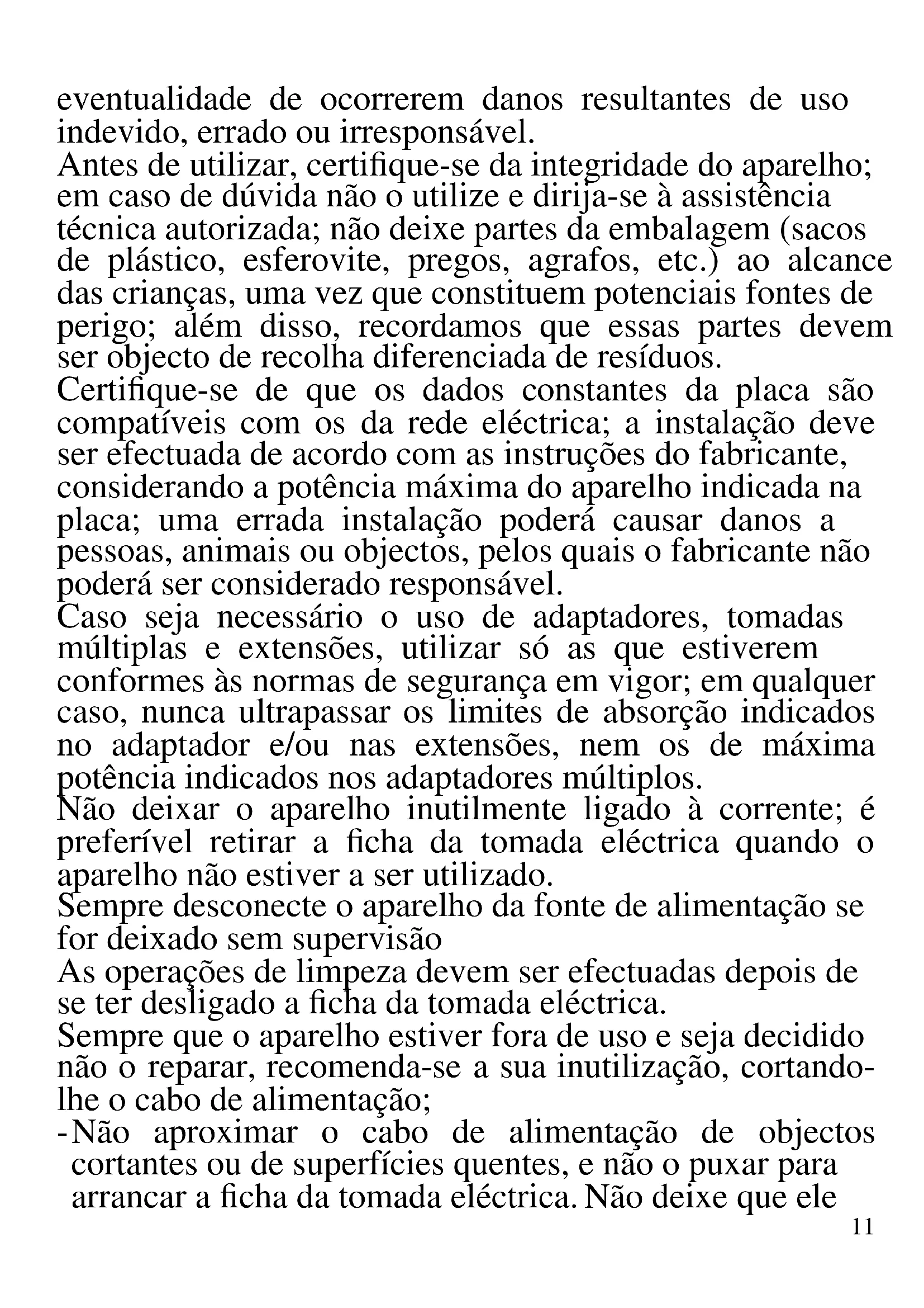 As indicações seguintes são muito importantes no que se refere à instalação, uso e manutenção deste aparelho; conserve com cuidado este manual para eventuais futuras consultas; utilize o aparelho apenas do modo indicado neste manual de instruções; outro tipo de utilização deverá considerar-se inadequado e perigoso; por isso, o fabricante não poderá ser considerado responsável na11 eventualidade de ocorrerem danos resultantes de uso indevido, errado ou irresponsável. Antes de utilizar, certifique-se da integridade do aparelho; em caso de dúvida não o utilize e dirija-se à assistência técnica autorizada; não deixe partes da embalagem (sacos de plástico, esferovite, pregos, agrafos, etc.) ao alcance das crianças, uma vez que constituem potenciais fontes de perigo; além disso, recordamos que essas partes devem ser objecto de recolha diferenciada de resíduos. Certifique-se de que os dados constantes da placa são compatíveis com os da rede eléctrica; a instalação deve ser efectuada de acordo com as instruções do fabricante, considerando a potência máxima do aparelho indicada na placa; uma errada instalação poderá causar danos a pessoas, animais ou objectos, pelos quais o fabricante não poderá ser considerado responsável. Caso seja necessário o uso de adaptadores, tomadas múltiplas e extensões, utilizar só as que estiverem conformes às normas de segurança em vigor; em qualquer caso, nunca ultrapassar os limites de absorção indicados no adaptador e/ou nas extensões, nem os de máxima potência indicados nos adaptadores múltiplos. Não deixar o aparelho inutilmente ligado à corrente; é preferível retirar a ficha da tomada eléctrica quando o aparelho não estiver a ser utilizado. Sempre desconecte o aparelho da fonte de alimentação se for deixado sem supervisão As operações de limpeza devem ser efectuadas depois de se ter desligado a ficha da tomada eléctrica. Sempre que o aparelho estiver fora de uso e seja decidido não o reparar, recomenda-se a sua inutilização, cortando- lhe o cabo de alimentação; - Não aproximar o cabo de alimentação de objectos cortantes ou de superfícies quentes, e não o puxar para arrancar a ficha da tomada eléctrica. Não deixe que ele12 fique pendurado na bancada onde a criança pode segurá- lo. Não utilizar o aparelho no caso de o cabo de alimentação ou a ficha se encontrarem danificados, ou em caso de curto-circuitos; Nessa eventualidade, leve o aparelho a um centro de assistência autorizado. - Não expor o aparelho a condições atmosféricas adversas, como chuva, humidade, gelo. Conserve em lugar seco. - Não manusear ou tocar o aparelho com as mãos molhadas ou os pés descalços. - Este aparelho não pode ser usado por crianças, mesmo com mais de 8 anos. - Este aparelho pode ser por pessoas com reduzida capacidade física, sensorial ou mental, ou ainda com falta de experiência na sua utilização, desde que lhes seja assegurada uma adequada supervisão ou se tiverem sido instruídas no uso do aparelho em segurança. - As crianças não devem brincar com o aparelho. - Mantenha o aparelho e o cabo de alimentação fora do alcance de crianças com menos de 8 anos de idade. Se o cabo de alimentação estiver danificado, ou em caso de falha e / ou avaria, não mexa no aparelho. Qualquer reparação deve ser realizada pelo fabricante ou pelo seu serviço de assistência técnica ou, em qualquer caso, por uma pessoa com qualificação semelhante, a fim de evitar qualquer risco. O não cumprimento dos itens acima pode comprometer a segurança do equipamento e invalidar os termos da garantia. ATENÇÃO: este aparelho inclui uma função de aquecimento. Algumas superfícies, mesmo que não a placa propriamente dita, poderão atingir temperaturas elevadas. Uma vez que a sensibilidade à temperatura difere de pessoa para pessoa, este aparelho deverá ser usado com CUIDADO. Coloque o aparelho exclusivamente sobre superfícies com aderência e preparadas para o efeito13 - Este aparelho foi concebido para uso doméstico ou equivalente, em situações como as de refeitórios em pequenas empresas ou outros ambientes de natureza laboral; por clientes de hotéis, motéis ou acomodação turística, como turismo rural ou residencial. - Este aparelho não foi concebido para ser utilizado por intermédio de um temporizador externo ou de um sistema de comando à distância autónomo. - Antes de cada utilização, soltar o cabo de alimentação. - Utilizar somente acessórios e componentes originais. - Não sujeite a impactos, pois isso pode danificá-lo. - Manter o aparelho afastado de materiais inflamáveis, fontes de calor, zonas frias e vapor.